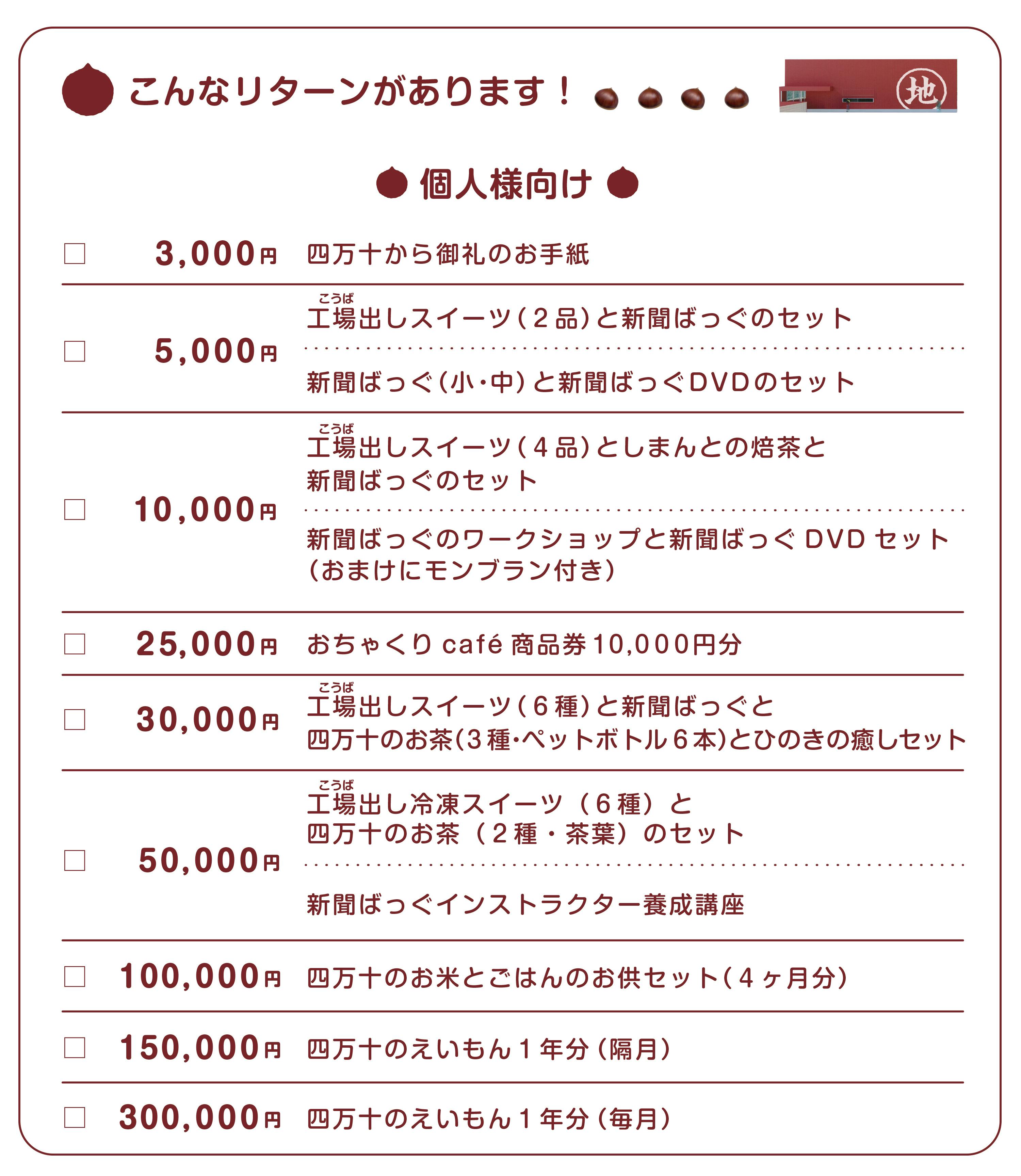 今回は多種多様なリターンを用意しました。個人の方から、企業・団体の方まで幅広く支援いただけます。ぜひ、ご検討いただけますと幸いです。