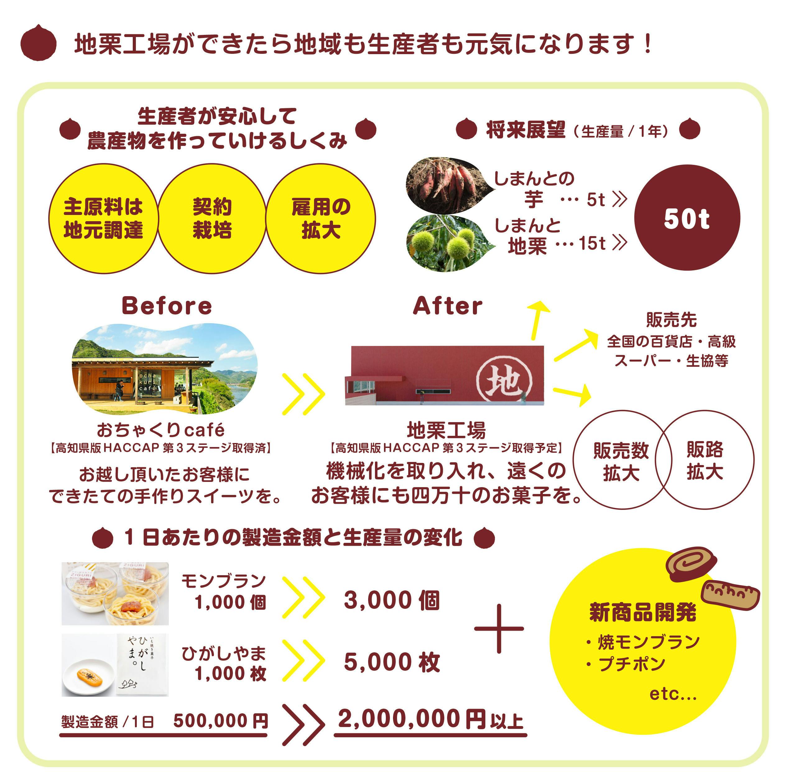 幸い弊社では、平成26年から「しまんとおちゃくりcafé工場」を建設し、四万十の栗や芋のお菓子を加工販売してきました。栗や芋をペースト加工して使用することにより、生産者には少しでも安定し栽培をして頂くようになったと思います。