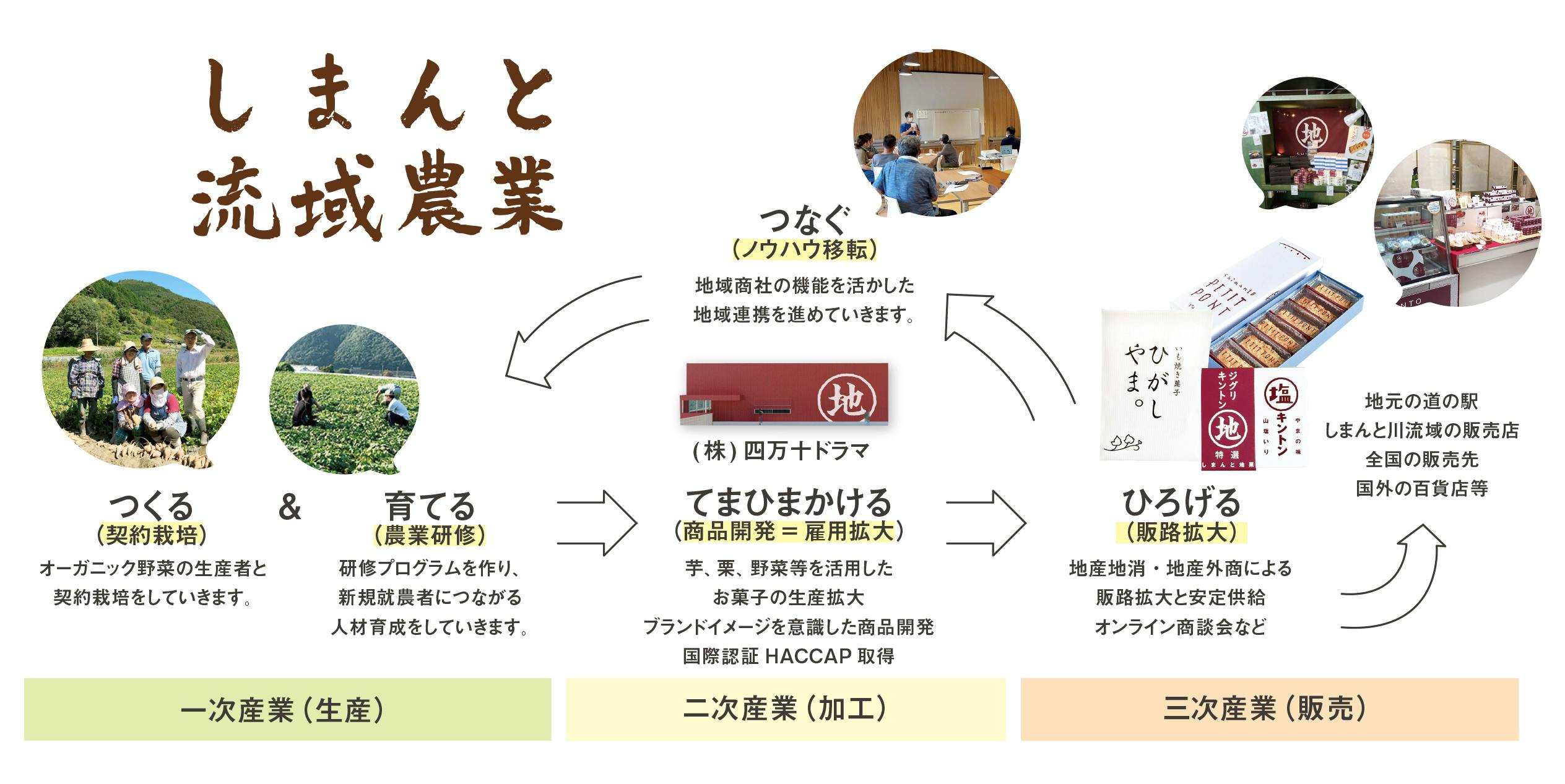 四万十川流域にある素材を活用し、地域の生産者や事業者とともに、弊社の「地域商社」機能を最大限活かせるような取り組みをしていきます。「しまんと流域農業」のビジョンを以下にまとめました。