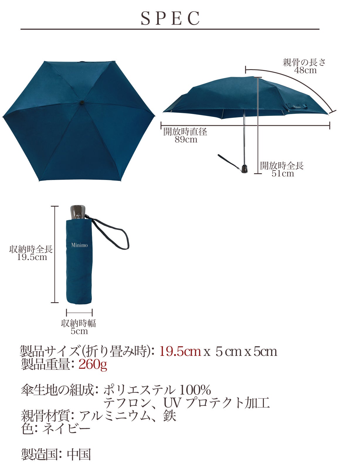 その結果として我々が選んだ要素が「携帯性」(=収納時の小ささ)、「即時使用性」(=自動開閉であること)「撥水性」「UVカット性能」でした。そして、それ以外の要素は全て普通程度のスペックにそぎ落としました(ただし重量260gと自動開閉としてかなりの軽量感です)。本商品は設計思想の面でも、ミニマリスト志向の傘といえるでしょう。