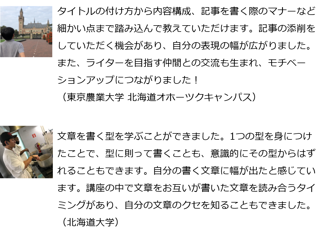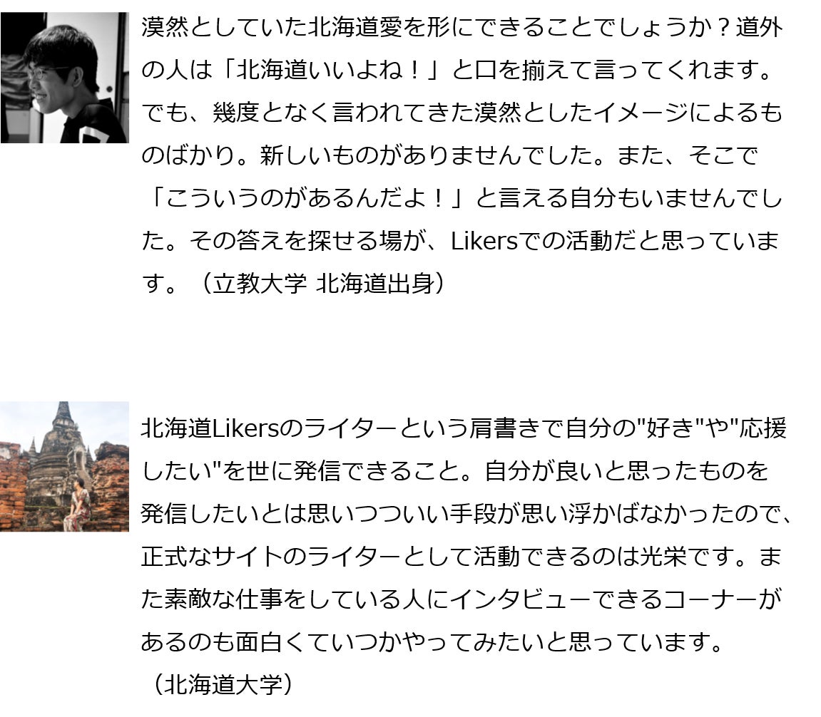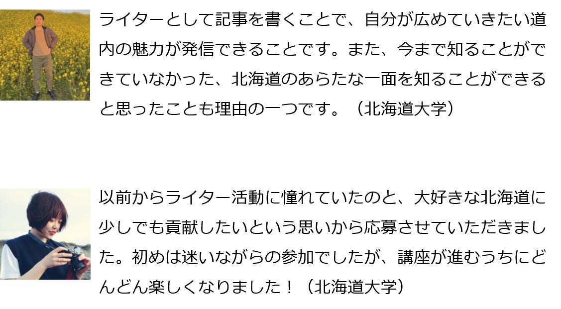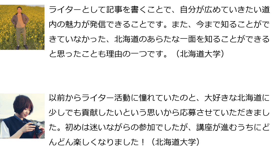 講座を無事合格し、現在北海道Likersの公式学生ライターとして活動してくれているメンバーの、一部の声をお届けします!