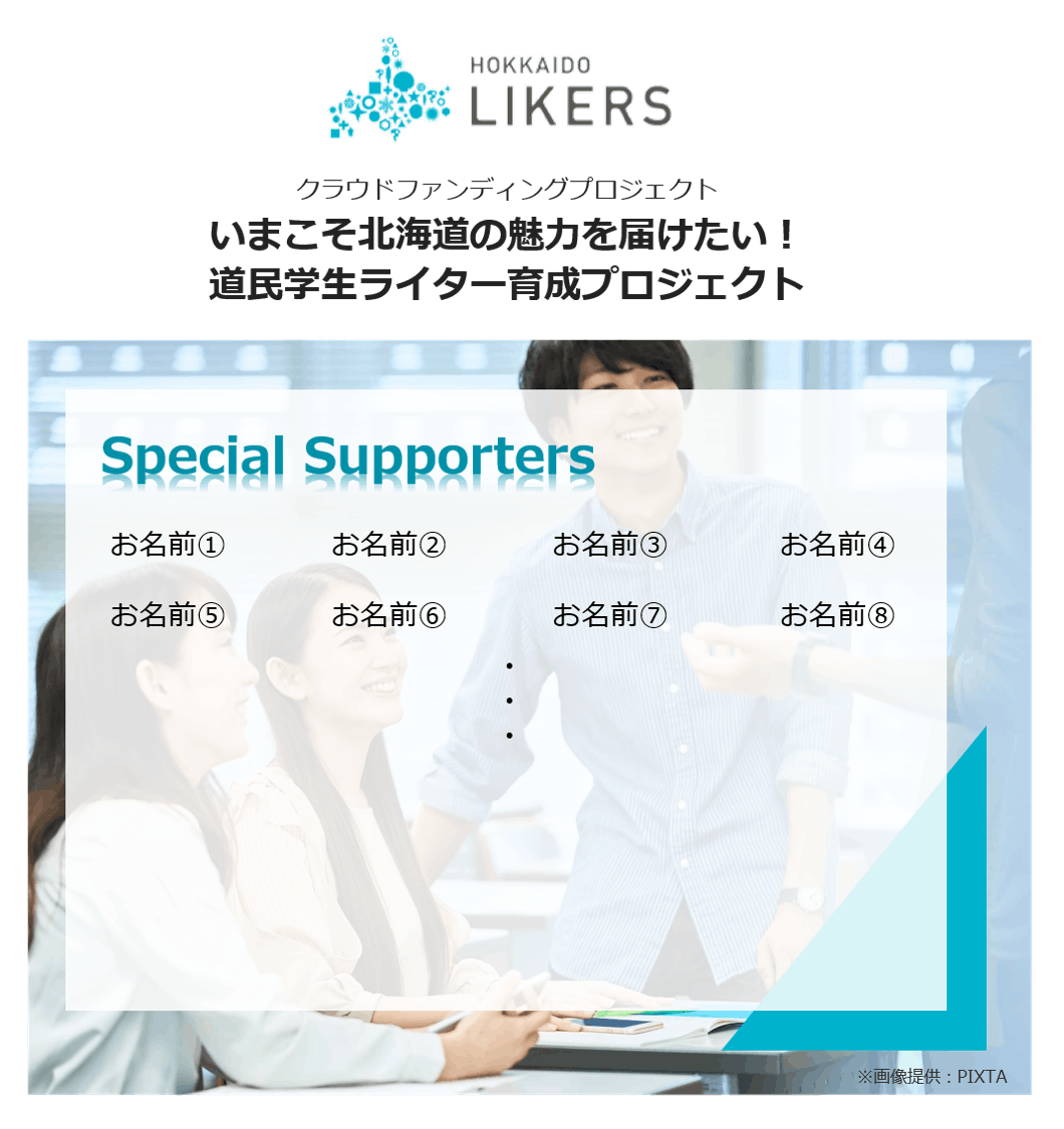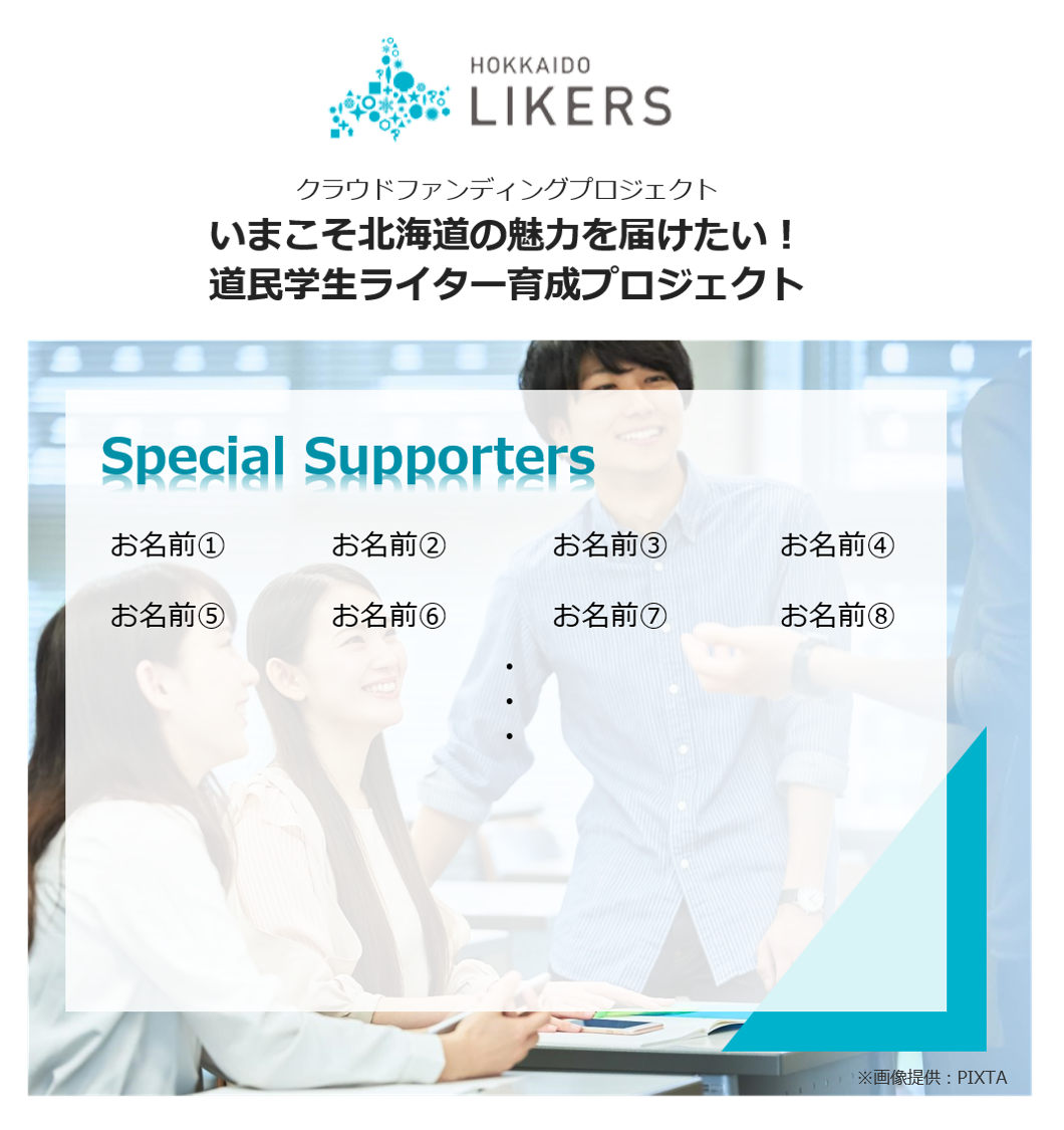 北海道Likers内にて掲載する「発信者育成プロジェクトページ」にて、本リターンで応援してくださった方のお名前を「スペシャルサンクス」として掲載させて頂きます!(※画像はイメージです。)