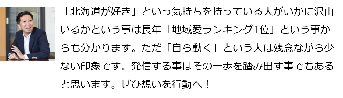 特に地域において、情報の非対称性はまだまだあると感じています。個人のメディア化が進むなか、たくさんの人が“それぞれの言葉で”情報を伝えていくことが大切です。これからの北海道の未来を担う、想いある若い世代が、熱く深く魅力を伝える・地元のために自ら行動するーその“熱量”こそが共感の輪を広げ、北海道の活性化につながると、私たちは考えています。