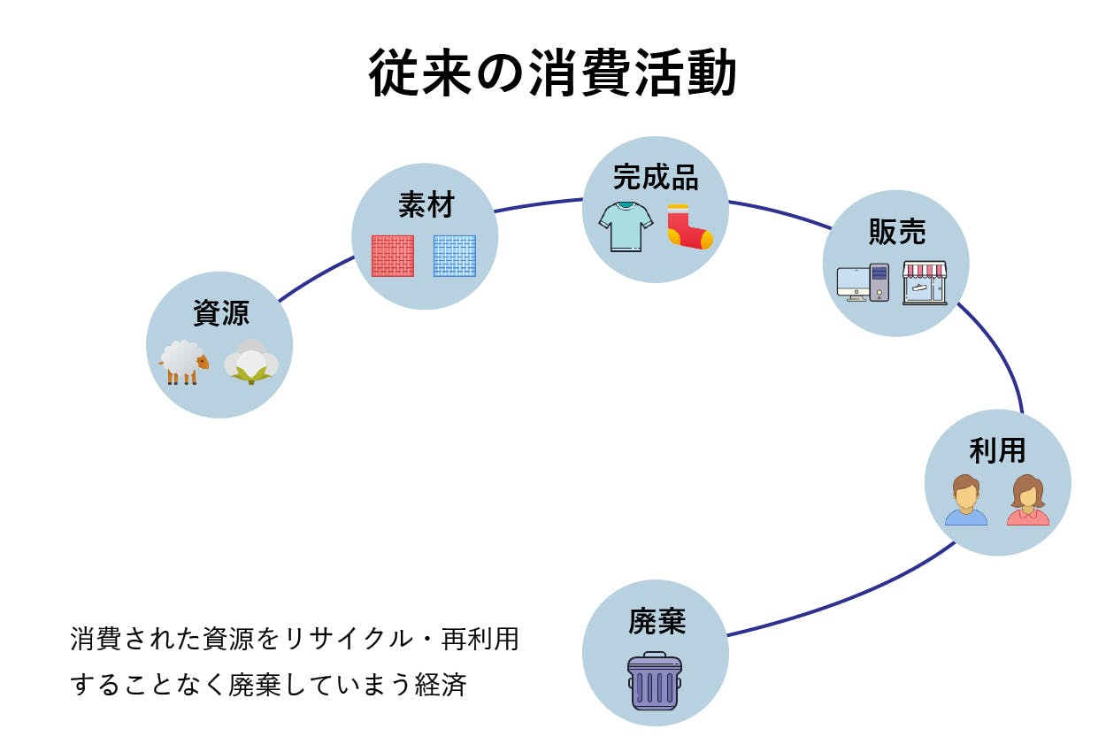 今までのモノの消費活動は以下の画像のように資源として使われたモノは利用された後、廃棄されていました。
