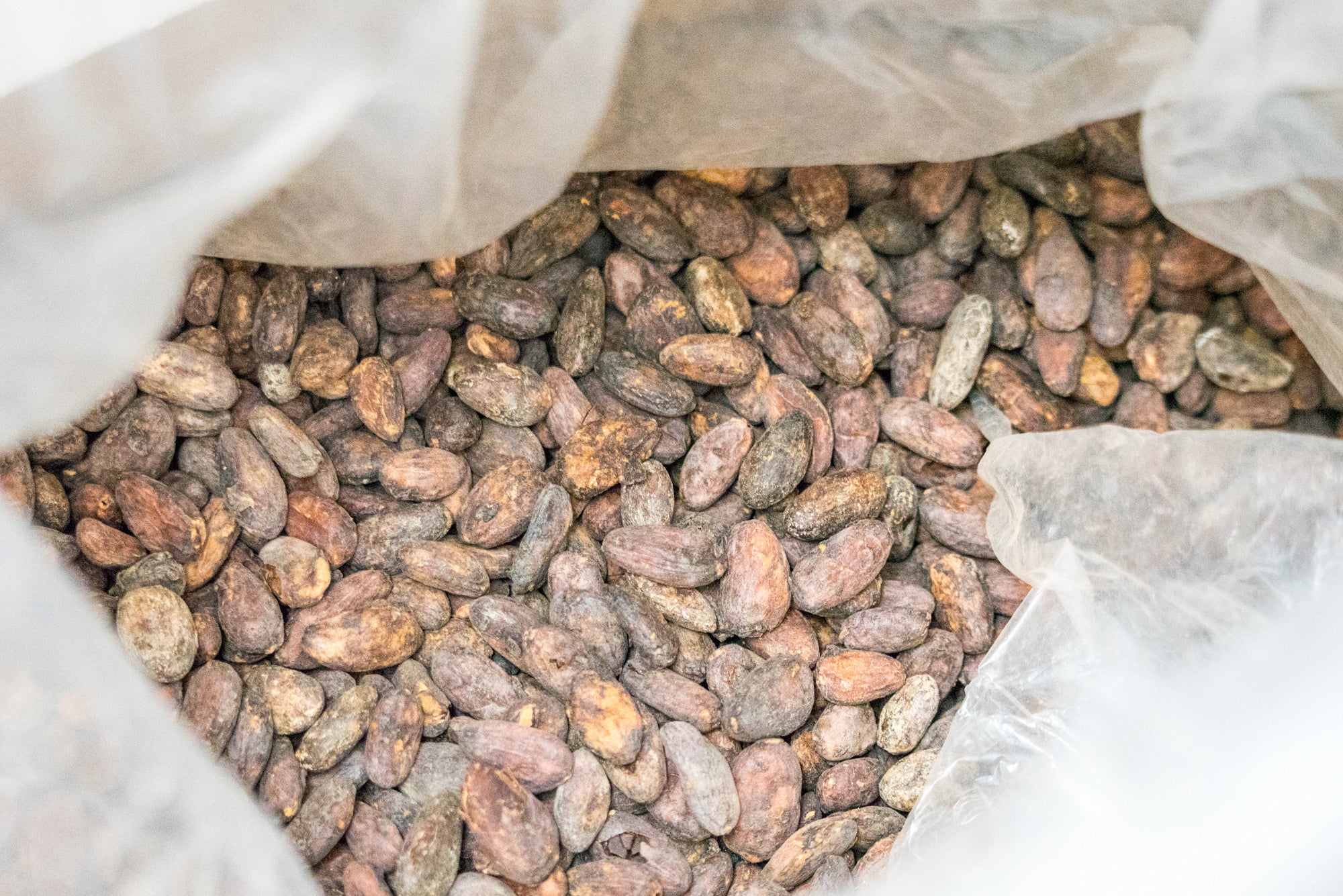 ▲砕いたカカオ豆に皮や不純物などが混じっていないか手作業でチェックします