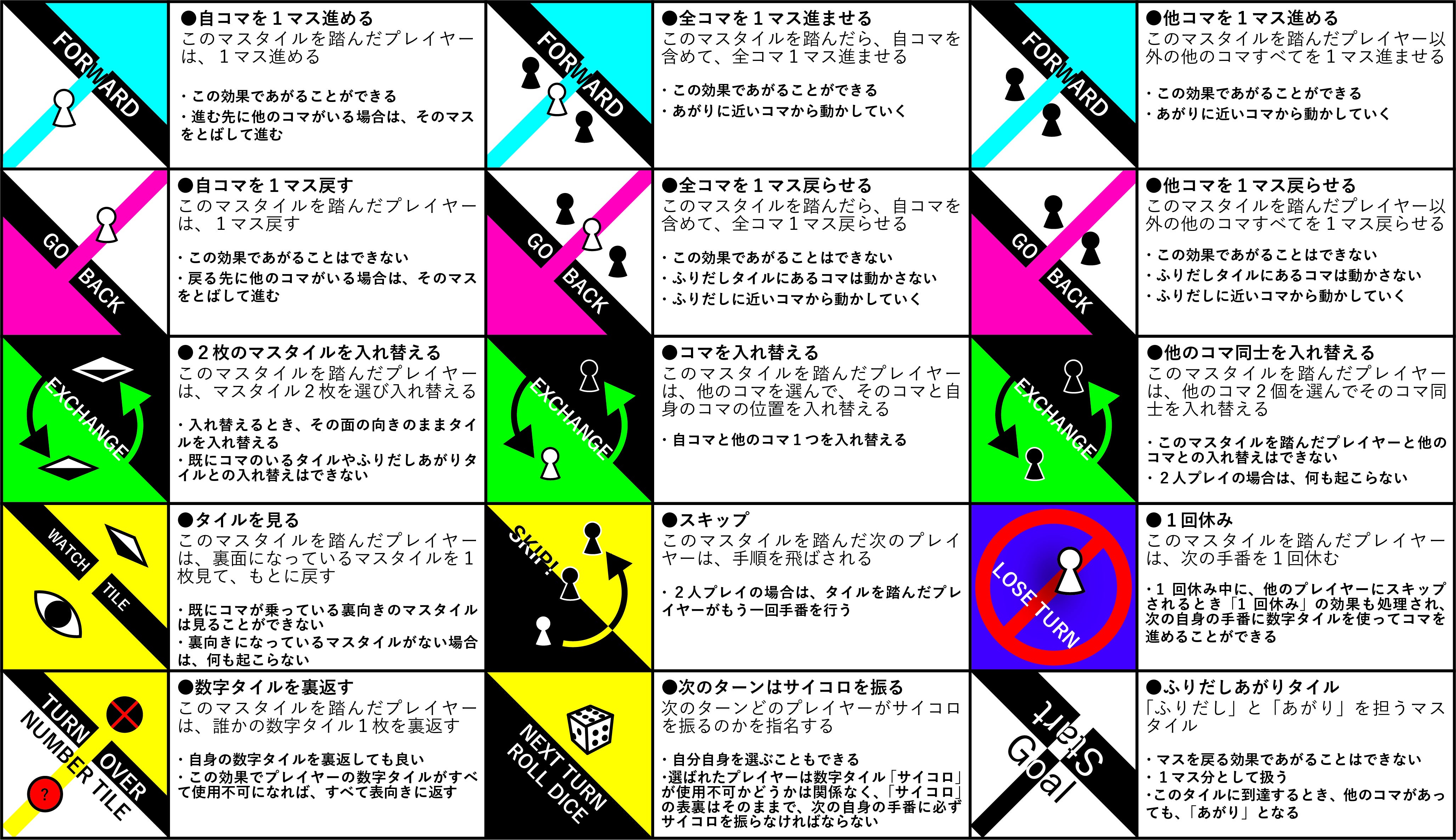 背景が青色→前進マス、赤色→後退マス、緑色→交換マス、黄色→特殊マス、紫色→休止マス