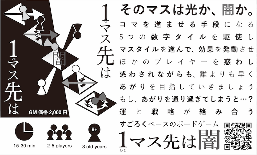 名前の由来:「これから先のことはどうなるのか、まったく予測できないことのたとえ」として使われることわざ「一寸先は闇」になぞらえて、1マス先のことはまったく予測できないという意味を込めて、「1マス先は闇」と名付けました。