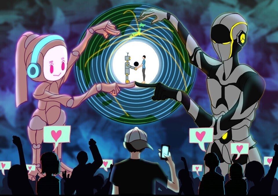 設定ではロボットは自らの意思で動いているのですが、実際のロボットの中身は、AIが観客とTwitterを観察し選曲、または新たな曲や音を生み出すことで、ロボットと人の空間的なコミニケションやインターネット上でのコミニケションが相互に可能となります。このように唯一の共通言語である音楽を通して、人とロボットが一体感を味わえる空間や機会を提供することがDJロボットの真の価値であると考えています。