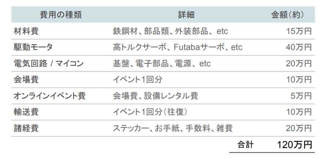 支援額が多いほど倉庫を借りるなどして、スピード感を持ってクオリティーの高いロボットが作れると確信しています。力強いスタートを切るよう皆様のお力添えをお待ちしています!