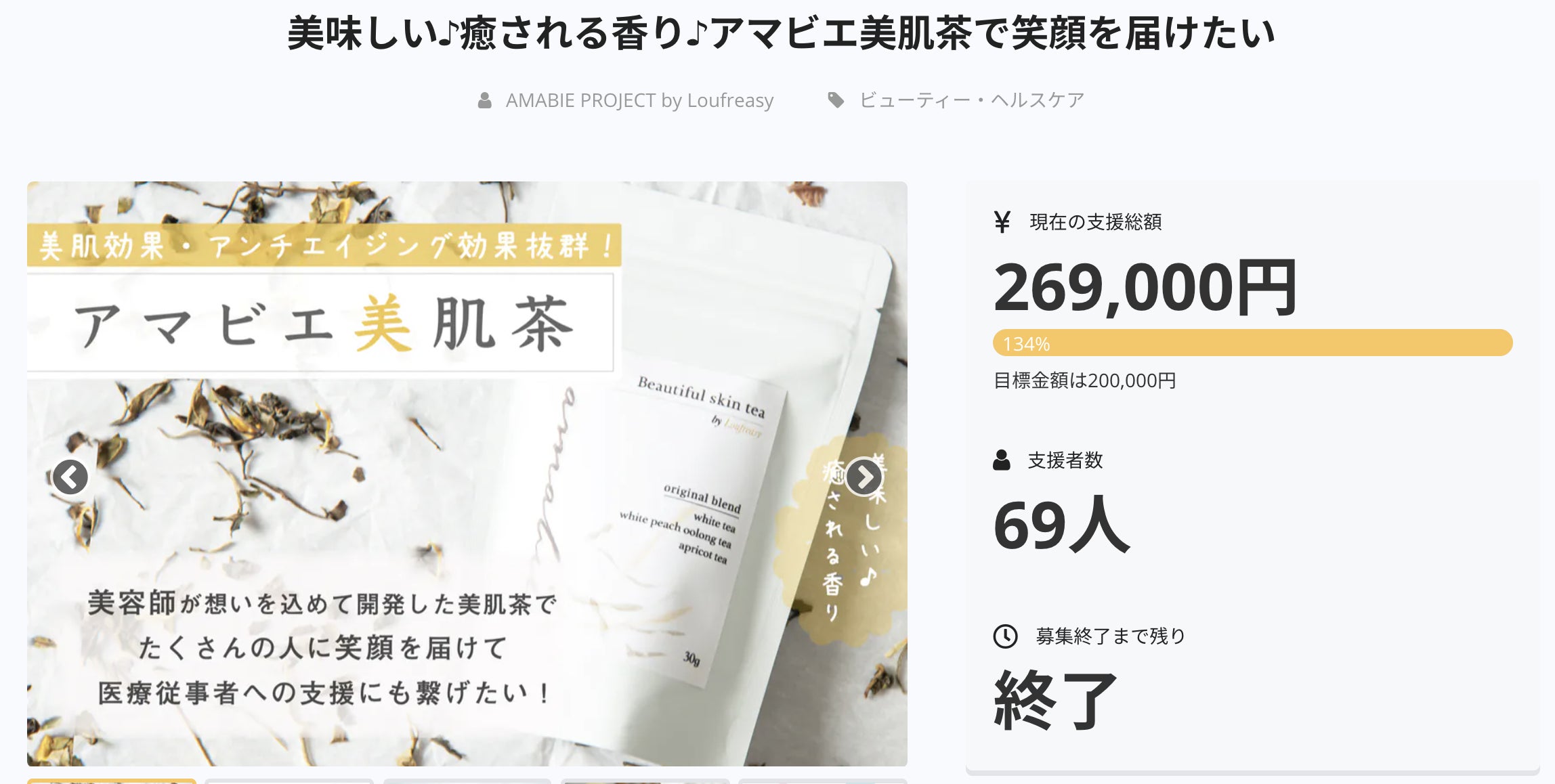 2020/12/01 17:18こんにちは、ラフリジー・アマビエプロジェクト主宰のトザワです『ヘアスタイルやメイク、ファッションなどの【外見】はもちろん“美しい”ということの根本となる【インナービューティ】【健康美】【カラダの中からの“キレイ”】もサポートさせて頂きたい!』美容の専門家・現役美容師であるぼくが、そんな想いを込めて開発した美肌効果やアンチエイジング効果・デトックス効果抜群!美味しい♪癒される香りの【アマビエ美肌茶】このお茶でたくさんの人に “キレイ” と “笑顔” を届けて医療従事者支援にも繋げたい!そんな想いで挑戦した、今回のクラウドファンディングぼくたちの“想い”にご共感頂いたたくさんの方からのご支援のお陰様を持ちまして【 134% 】で達成し、無事終了致しました!ぼく自身にとっても、初めてのクラファンへの挑戦 ぶっちゃけ、めちゃめちゃ不安で心配でした!!!!!!笑 『世間では全く誰にも知られていない東京・代々木の片隅にある小さな美容院の挑戦なんて応援してくれる方がいるんだろうか…』毎日そんな気持ちでこのクラファンの【管理画面】を何度も何度も確認し笑動くもの全てに頭を下げてるんじゃないか!?というくらい友人・知人、その日に会った全ての人に自分の“想い”を伝え頭を下げるそんな、アッという間の1ヶ月間でしたがご支援頂いた皆様から頂いたこんなコメントに本当に元気や勇気を頂きながらなんとか達成することができましたご支援頂いた皆様ぼくたちの挑戦を応援して下さっている皆様本当に、本当にありがとうございました【ご支援頂いた皆様へ】 ★ご自宅への郵送の方 12/9 頃から、リターンの商品を順次発送させて頂きます12月中旬頃までには、全ての方にリターンをお届けできる予定となっておりますので楽しみにしていて下さいね✳︎★代々木ラフリジーでお受け取りの方12/9 頃には、リターンの商品のご準備が完了する予定ですお渡しの方法など、詳細につきましてはメールにてご連絡させて頂きますのでご確認のほど、何卒宜しくお願い致します【『アマビエ美肌茶』につきまして】アマビエ美肌茶につきましては、正式に商品化し代々木ラフリジー のサロン店頭と【ラフリジー・アマビエプロジェクト】の OFFICIAL WEB SHOP の両方で販売を開始する予定です正式に販売を開始した後も、売り上げの【5%】をコロナ禍収束への希いを込めて引き続き【国際国立感染症センター】に寄付を続けていきます販売開始は、12月中旬を予定しておりますので楽しみにお待ち下さいませ✳︎【医療従事者の方々への支援につきまして】今回のクラウドファンディングで皆様から頂いた支援総額【 269,000円 】の【 10% 】にあたる【 26,900円 】はぼくたちはもちろん全人類共通の希いである『コロナ禍収束』への想いを込めてコロナウイルスを含めた感染症の診療・研究を推進しぼくたちが生きているこの社会を維持するためにコロナ禍の最前線戦で戦って下さっている【国立国際医療研究センター】の医療従事者の方々への支援ために使用させて頂きますCAMPFIRE 様の規定によりクラウドファンディングで集めた資金の一部を第三者に直接寄付することができないため今回のクラウドファンディングで皆様から頂いたご支援は一度、この【アマビエ美肌茶】を正式に商品化するための資金として使用させて頂き正式に商品化し、販売を開始した後【 26,900円 】に至るまでは売り上げの全額を【国際国立感染症センター】に寄付するという形で皆様から頂いたお気持ちを、責任をもってお届けします寄付の完了は、2021年の1月末を予定しておりますので完了しましたらこの【活動報告】でもきちんとご報告させて頂きます 【 “小さなこと” を “大きな心” で 】 『私たちには “大きなこと”はできません“小さなこと”を “大きな心”でするだけです』マザーテレサは、こう言ったそうですぼくたちが“想い”を込めて“商品としてのクオリティ” にもとことんこだわって創ったこの【アマビエ美肌茶】でカラダの中から“キレイ”になりながら健やかな毎日を “ 笑顔 ” で過ごして頂くことをぼくたちが生きているこの社会を支えるために最前線で戦って下さっている医療従者の方々への支援にも繋げる【ラフリジー・アマビエプロジェクト】というぼくたちの挑戦はまだ始まったばかりぼくたち美容師には、ウイルスを消滅させる薬を開発することも感染症で苦しむ患者さんの治療をすることもできませんでもこの活動にご賛同頂ける皆様応援して下さる皆様のお力をお借りしながらこの【ラフリジー・アマビエプロジェクト】を皆様と一緒に続けていくことで世界人類共通の希いであるコロナ禍の収束はもちろん人のため 社会のためにできること今の自分たちにできることを、前向きに続けていきたい一人一人の“小さな力”を合わせて優しい 明るい “笑顔あふれる未来”を、皆様と一緒に創っていきたいぼくたちは、心からそう思っております
