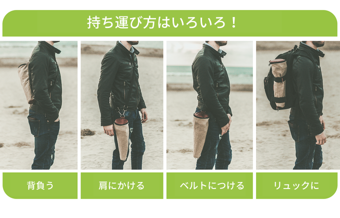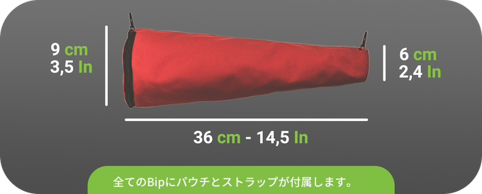 Bipの設計は特許取得済みで、簡単に折りたため、持ち運びも簡単。付属のキャリーストラップ付きのパウチの中に入れて持ち歩いたり、あらゆるバッグ、バックパックやスーツケースに入れて持ち運ぶことができます。ポーチにはリングがあるのでベルト(カラビナ使用)などに取付けて持ち運ぶことも可能です。