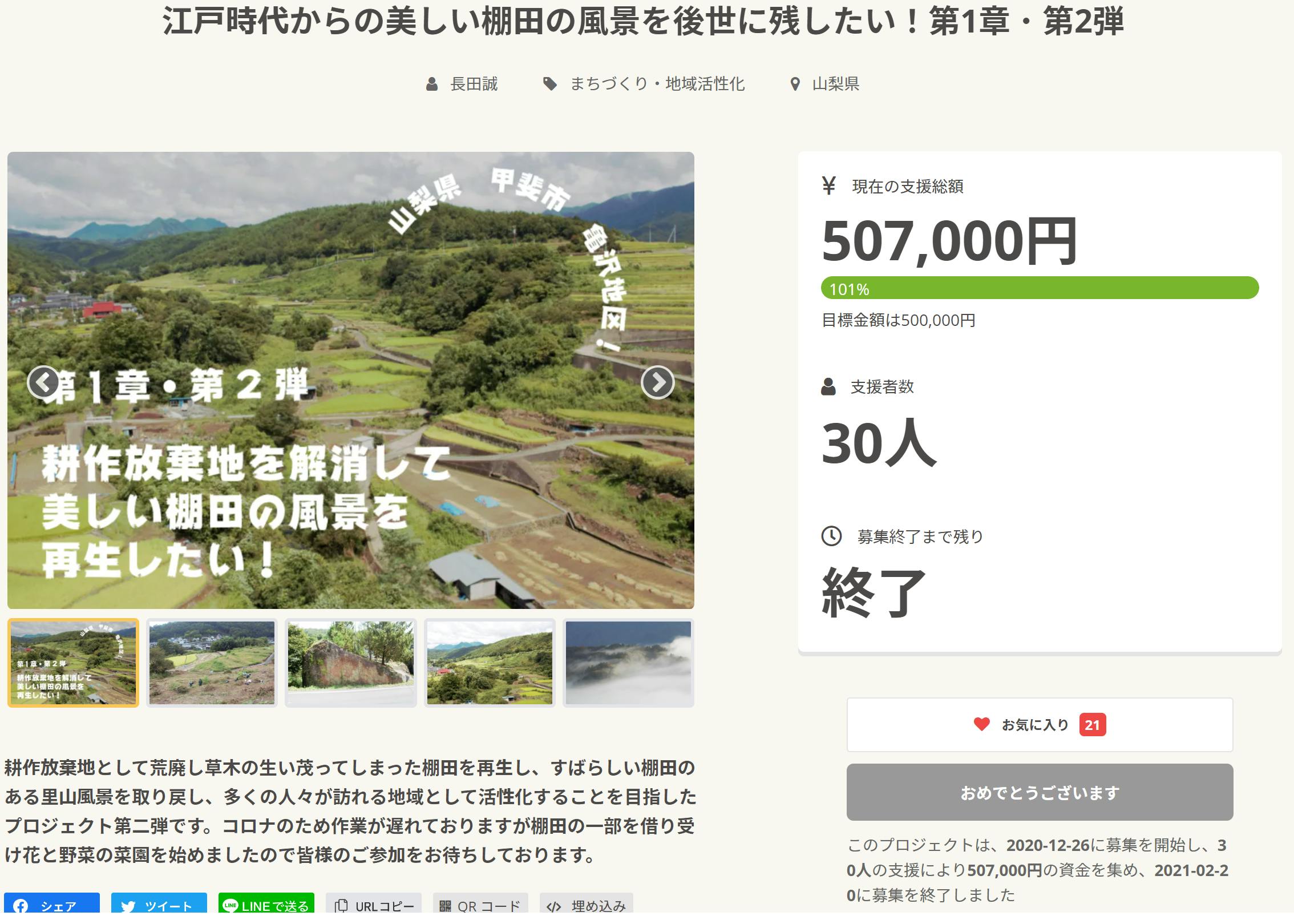 2021/02/21 00:48お世話になっております。亀沢地区棚田再生プロジェクトの長田です。まずは皆さま、たくさんのご支援誠にありがとうございます!20日にご支援の募集を終了し、見事目標金額に達成することができました!これも皆様のご支援とご愛顧のたまものです。ご支援いただいた資金をもとに棚田の再生を着実に進めて参りますので、今後とも亀沢地区棚田再生プロジェクトを応援していただければ幸いです。皆様の応援にお応えできるよう活動していきます!返礼品の発想は少し先になりますが、楽しみにお待ちいただければと思います。これからも私たちの活動を見守っていてください! もっと見るいよいよ明日、2月7日、棚田にて野焼き実施!