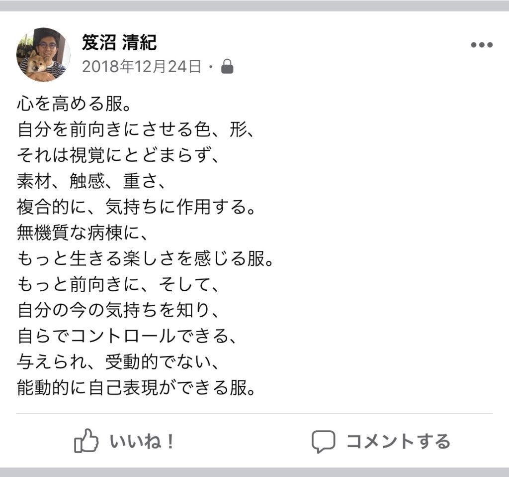 入院時に、⽗が病院から与えられた入院着は無機質で画一的で、、当時の僕の⽬には囚⼈服かのように映りました。病気で認知機能が低下しているとはいえ、無造作にその服を着せることが心苦しかった。