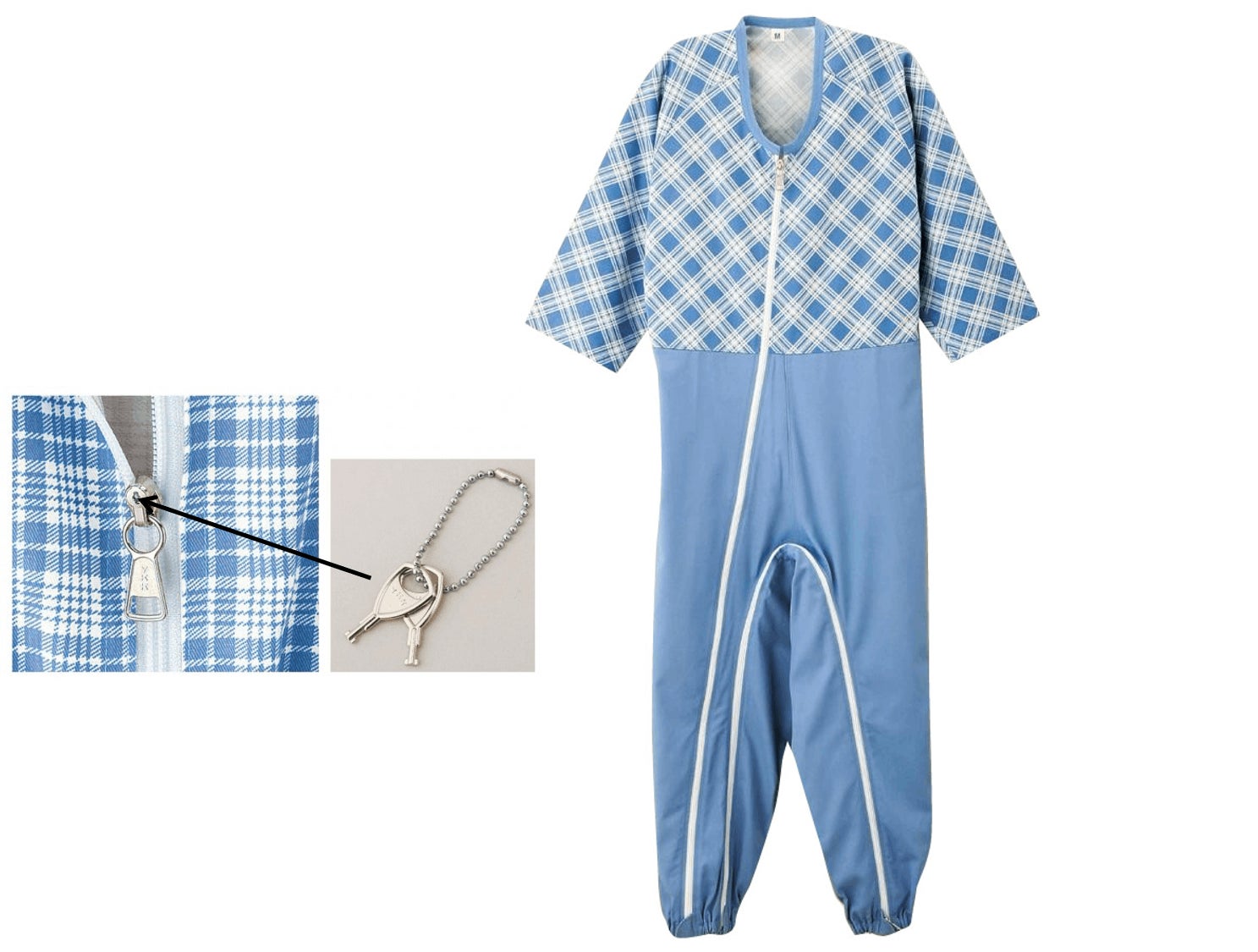 この時、入院着はつなぎ服に。 本人が服を脱いだり、身体を掻かないよう、チャックは首もとで鍵をかけられ固定されています。まるで ”服が人を拘束している“ のです。