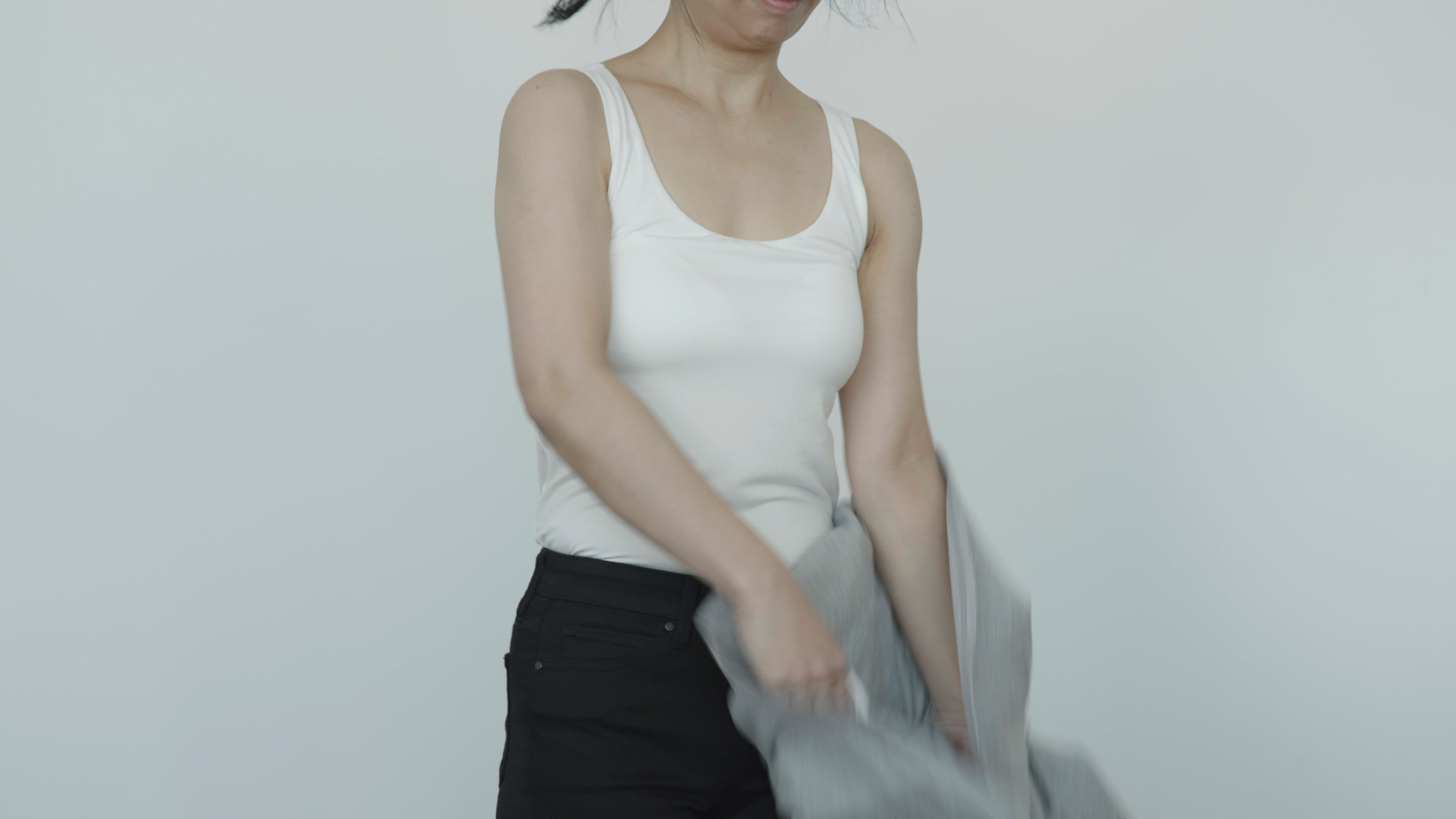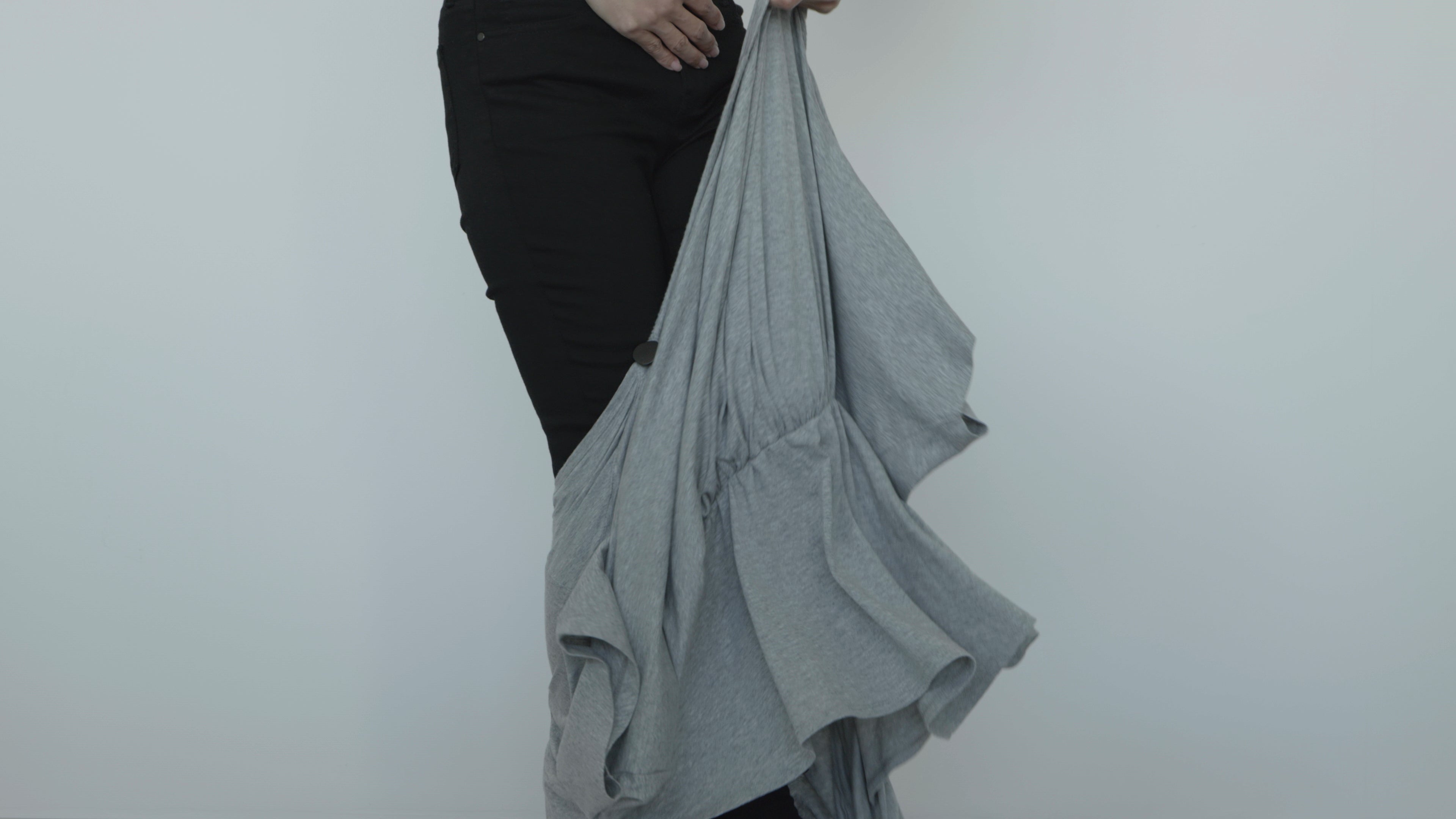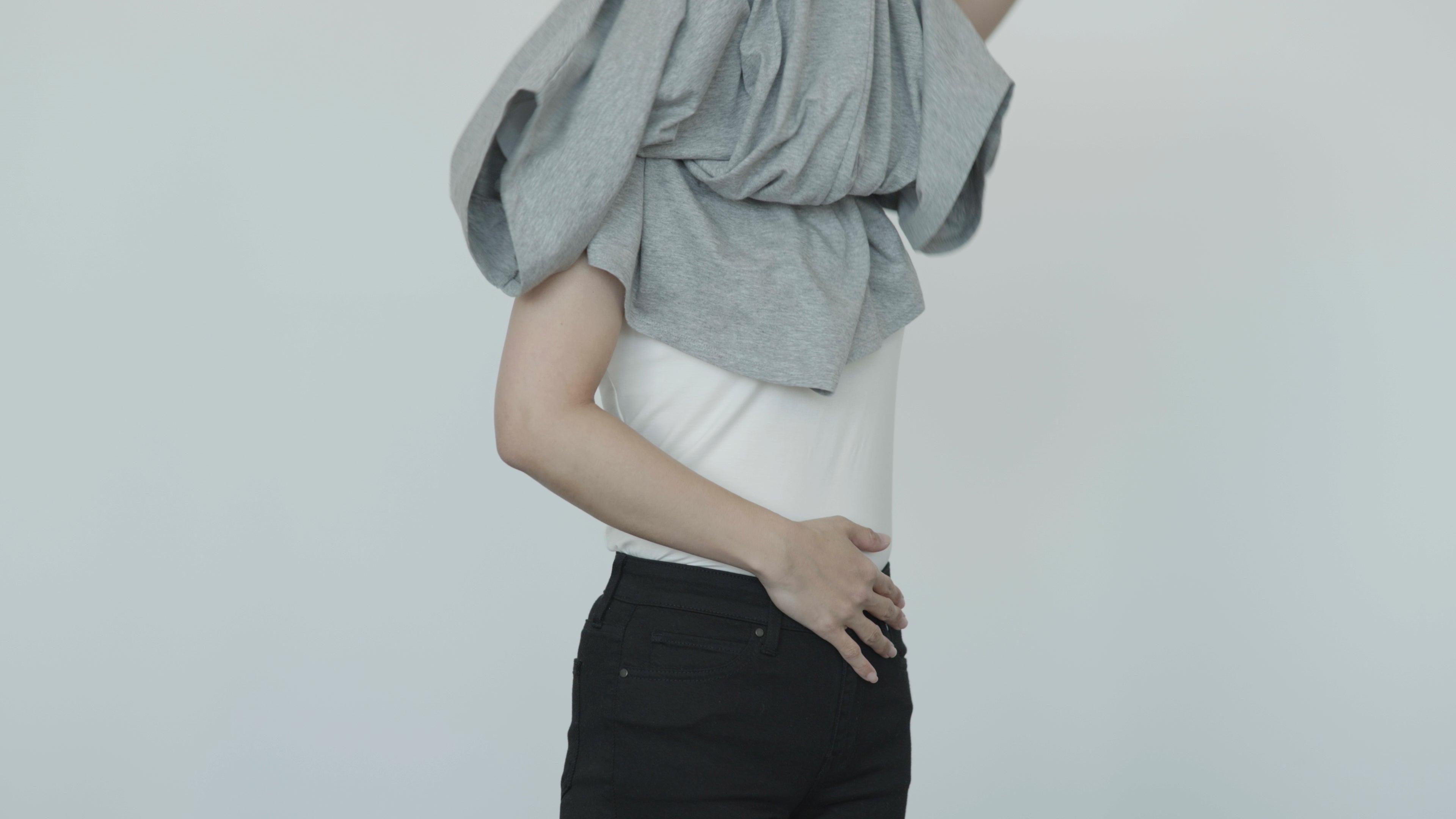 片手で服をつまんで上に引き上げる