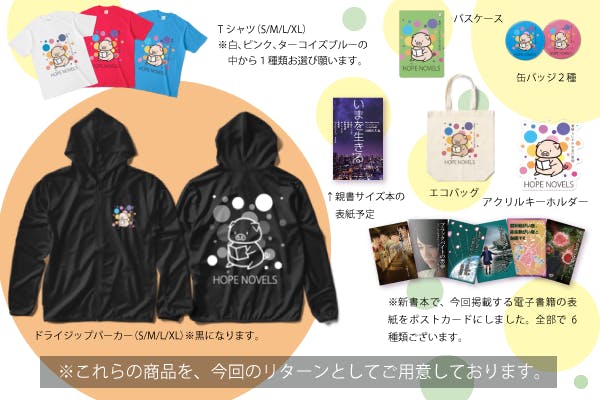 出版本1冊と特製エコバック、お礼状、ポストカード6種類、缶バッジ2種、アクリルキーホルダー、パスケース、Tシャツ1枚、ドライジップパーカー1枚、それと共に、当グループの障がい施設にて障がい者の方々が制作されたアクセサリーのレジン製品をお届けさせて頂きます。さらにオンラインにて、本にの出版に関わるエピソードが聴けるセミナー受講券を提供させて頂きます。(送料こちら負担)