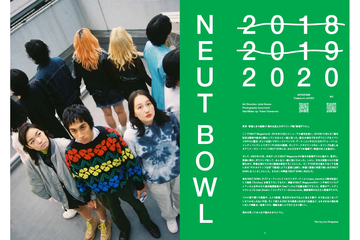 そこで2020年の「NEUT BOWL」は、集まらなくても楽しめる“オルタナティブな形”で開催しようと夏頃に決め、架空のイベント「NEUT BOWL 2020」をテーマにした映像と写真を笹塚ボウルで撮影し、読者の皆さんのもとへ届けることにしました。それが巻頭特集の「NEUT BOWL 2020」とミュージックビデオ「Torches」です。