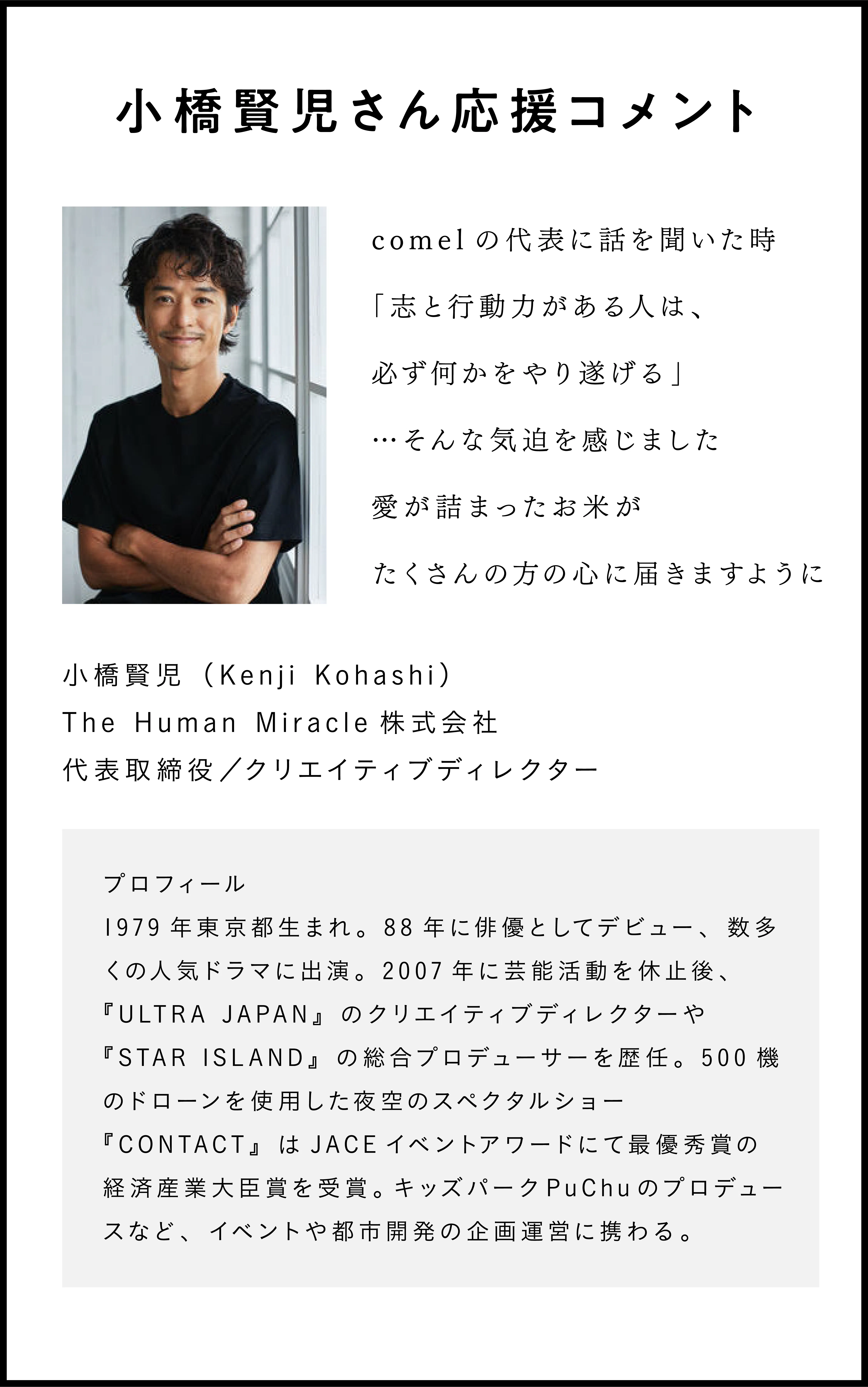 2021/01/17 11:47皆様あけましておめでとうございます。この度はクラウドファンディングご支援いただき誠にありがとうございます。全ての皆様に商品を届けることができ、SNSで皆様の嬉しい声が上がることが大変嬉しく思います。ギフトで渡された方も、自分にご褒美として買われた方も喜んでいただけたでしょうか?正直まだまだなところは多くあり、今回の配送でも皆様にご迷惑おかけしたことは多くあります。ただそんなcomelを皆様は応援してくださり、皆様にご支援いただき第一回に引き続き、第二回も80名の方にご支援いただき¥1056100円を達成することができました。本当にありがとうございました。そして近年ではコロナが大流行して、皆様はいかがお過ごしでしょうか? 再度の緊急自体宣言が発令され、皆様のお暮らしにも多大なる影響を与えたことだと思います。そして2/6,7に予定していたオープニングパーティも中止にせざる終えなくなりました。コロナという状況、緊急事態宣言という中で皆様も気持ちよくイベントを楽しめないんじゃないという想いから延期することといたしました。楽しみにしてくださった皆様本当に申し訳ありません。せっかくお会いして皆様に感謝を伝えられる日を楽しみにしていたので、本当に残念です。ただ延期としましては3月の上旬から中旬に開催を再度させていただこうと思いますので、その際はまた皆様にご報告させていただければと思います。よろしくお願いいたします。そしてそんな中でお米屋さんのcomelにできることを何かと考えた時、原点を省みて見ました。「お米を通して暮らしに温もりを」そんなコンセプトから始まったcomel。 そしてコメことばという商品で皆さんの暮らしを少しでも温かいものにしたい。こんな想いからはじまりました。この想いは、現代社会のスピード感に疑問を抱いたことがきっかけでした。現代を懸命に生きる人は日常に忙殺され、ストレス感じることが多くあり、"自分らしさ"に必要な大切なものを、見失ってしまう機会が多いと感じています。そんな現代社会のスピードはとても速く、ついていこうとするほど、自分らしいペースを失って心の豊かさが置いてきぼりになる。そんな中で多くの人は孤独を感じているのではないでしょうか?そしてそれはこの社会で生きるには必然のことだとも思います。スピード感についていこうとするほど、豊かさを見失い、孤独を感じ、繋がりを感じることができない。だからこそ、私たちは日常にあるお米を通して、皆様の暮らしに寄り添うことを決めたのです。そしてこの度今回ご支援していただいた方全ての方にオンラインサロン「Co Meal」にご招待させていただきたいと思います。このオンラインサロンは名前にもある通り、「Co(共同)」「Meal(食事)」という意味があります。共にする食事のように、みんなが一つのテーブルを囲んで温かい食事をするようにとそんな意味を込めて「Co Meal」としました。オンラインサロンに関してはまた再度告知させていただいてご招待させていただこうと思います。これからも皆様の暮らしに温もりを届けられることを楽しみにし、さらに素敵なお米を提供できるようにcomel一同頑張って参りますので今後ともよろしくお願いいたします。PSCES 2021 Panasonic in Tokyo にこの度comelは100BANCHというブースから出品させていただくことになりました。Youtubeもあるので是非ご覧ください。また今年はたくさんのコラボが生まれますので、楽しみにしていてください!! もっと見る