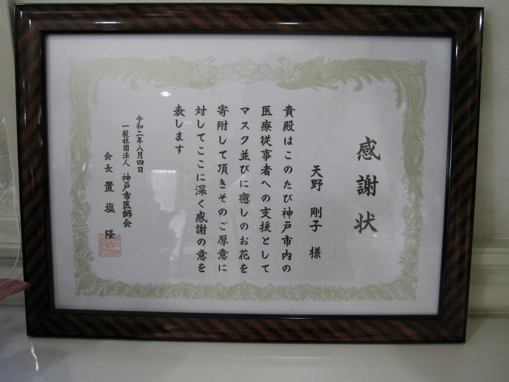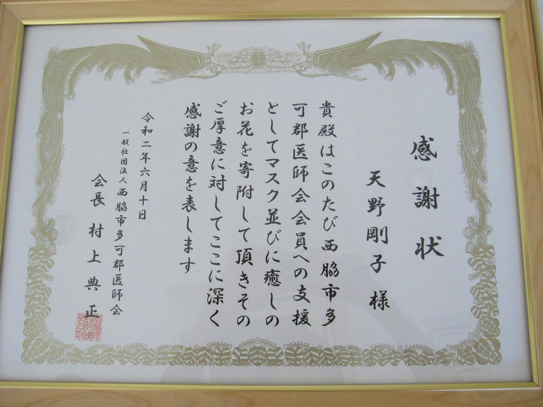 ▼西脇市多可郡医師会様よりマスク寄附の感謝状を頂きました。
