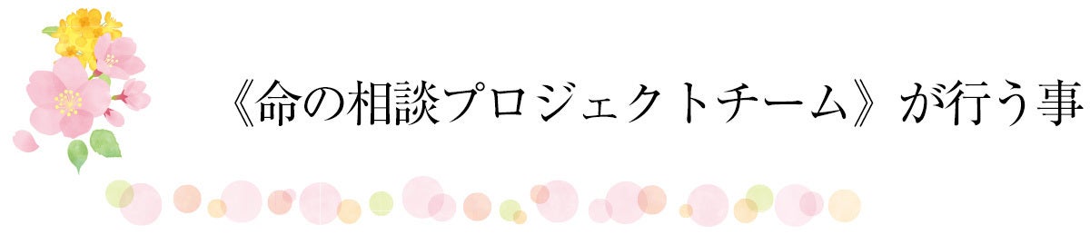 この命の相談プロジェクトは、介護疲れの方や、うつ、いじめ、DV、認知症、引きこもり、子育て、養育、コロナなどで心の悩みをお一人で抱えている方に対して、全国のボランティア・アドバイザーがお悩みを抱えているお一人お一人様に寄り添い、様々な対応(主に心のケア)を行っていくプロジェクトです。