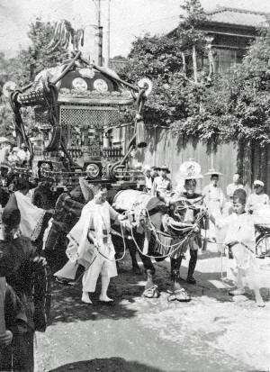 この白黒写真は昭和10年の御神幸を撮影したものです。とても大きな宮神輿の山車を、牛と共に大勢で引いている様子がわかります。