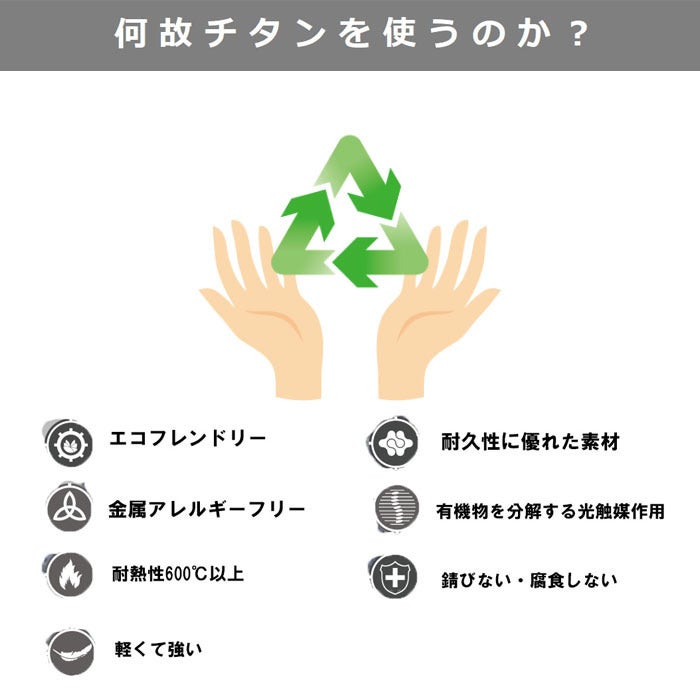 チタンは熱伝導が低いため、冷めにくい・手にもっても熱が伝わりにくい等の