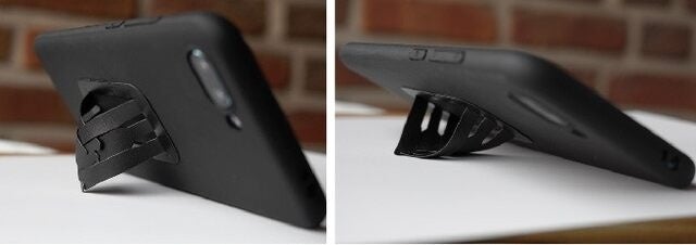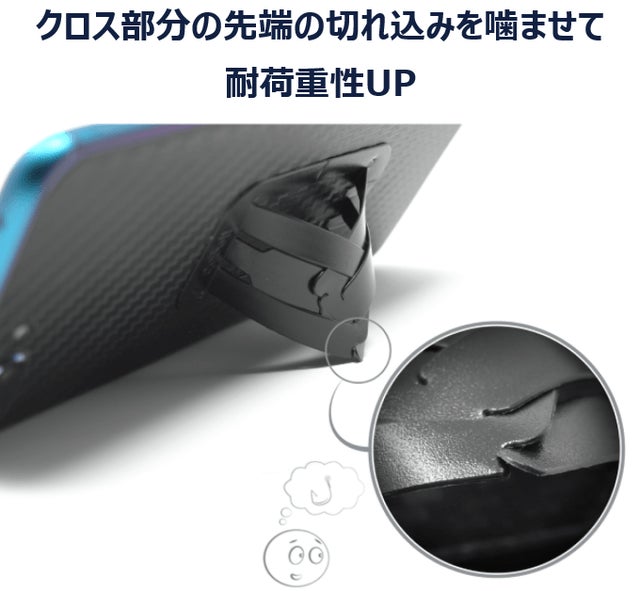 A6:スタンド時にgoBeltの端をクロスすることで、ロックできる機能を搭載しています。切れ込み部分をしっかりと噛ませて、強度を確保してください。また、Q3の通り、goBeltを貼り付ける際に角度を付けることで、スタンド利用時の安定性を確保することができます。