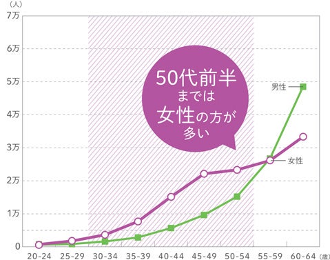 男女の年代別がん罹患率を見ると、30代、40代では女性のがん患者数は男性を大きく上回ります。
