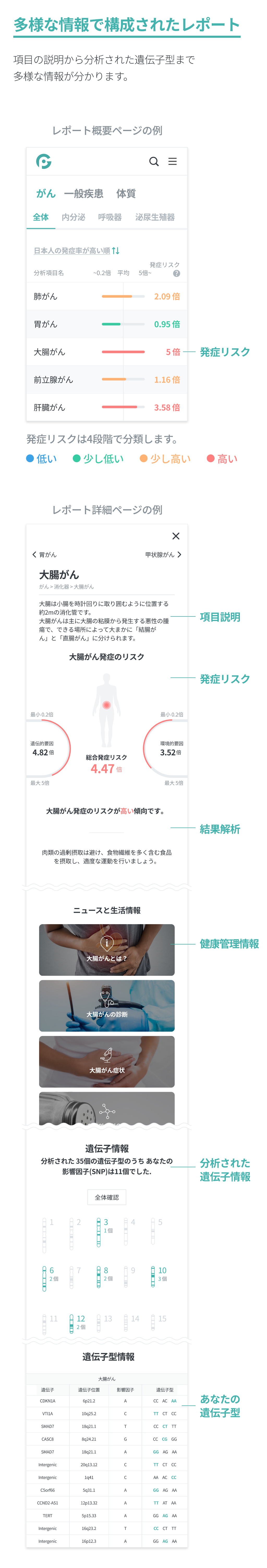 また、本サービスは遺伝子解析結果およびアンケート結果を基にして弊社独自のアルゴリズムにより算出したものであり、医療情報等は含みませんので予めご了承ください。本遺伝子検査結果に示される病気の発症リスクや体質の情報は、特定の塩基配列に関する統計的な確率を相対的な数字として表したものであり、特定の塩基配列を持つ集団の平均的な傾向及びリスクです。