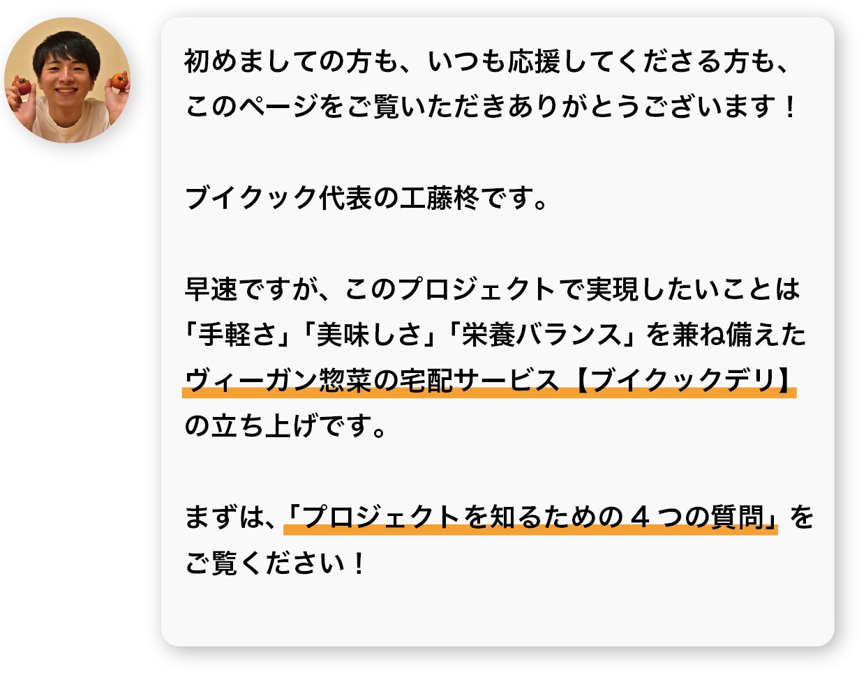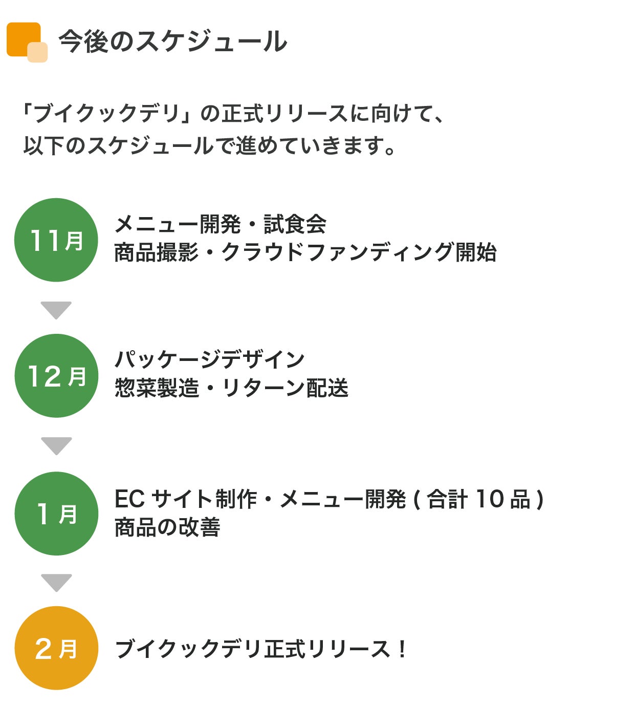 1つは、このプロジェクトをご支援いただきブイクックデリを経験していただき、ご意見をいただきたいです。今回届けするお惣菜に対して、量や味、パッケージなどへご意見をいただき、正式リリースまでに改善したいと考えています。