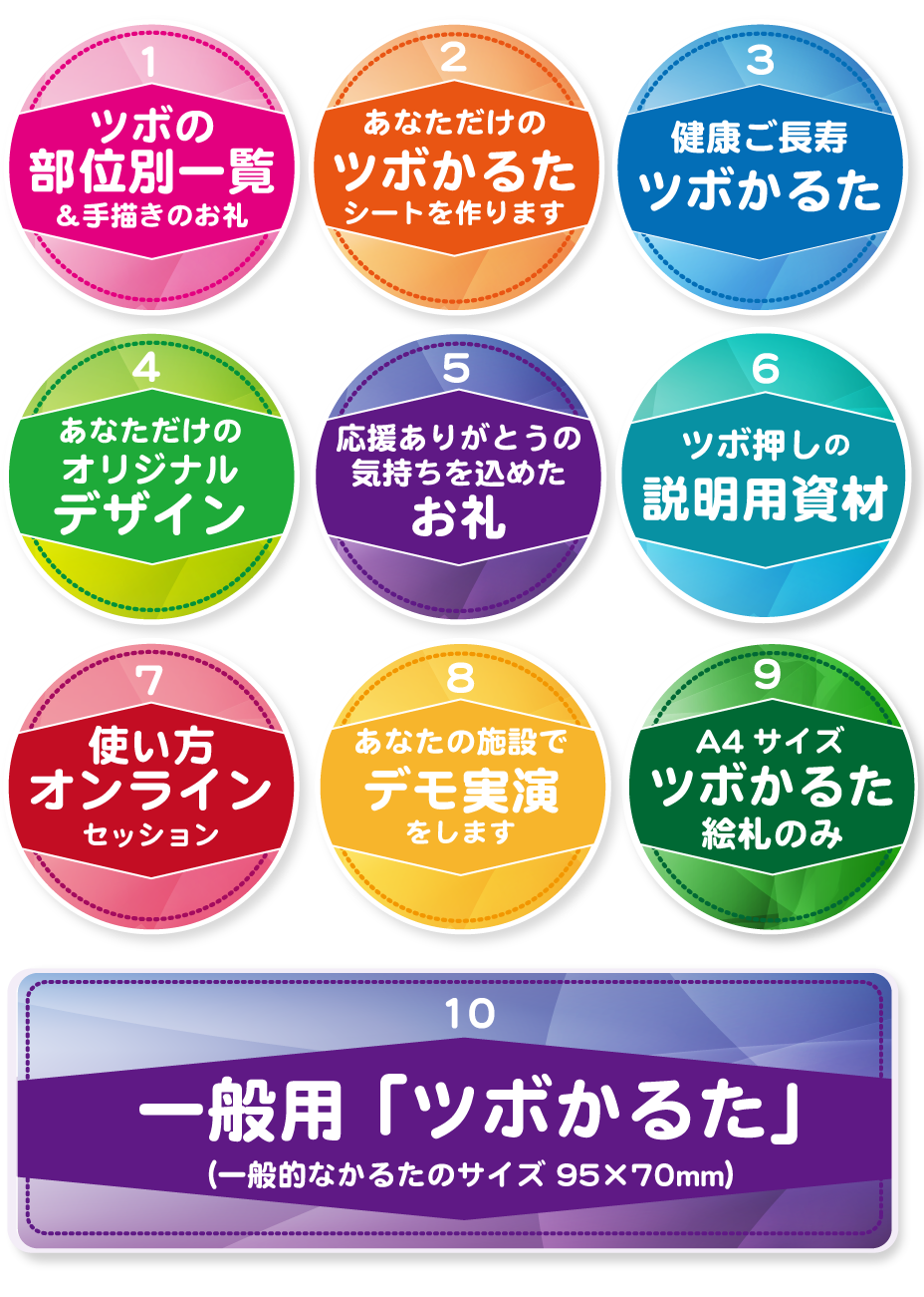 ツボかるたの開発者横山からのお礼の葉書のほか、ツボかるたのおもしろさ、使い方を直接伝授すべく、20分のオンラインセッションをつけさせていただきます。