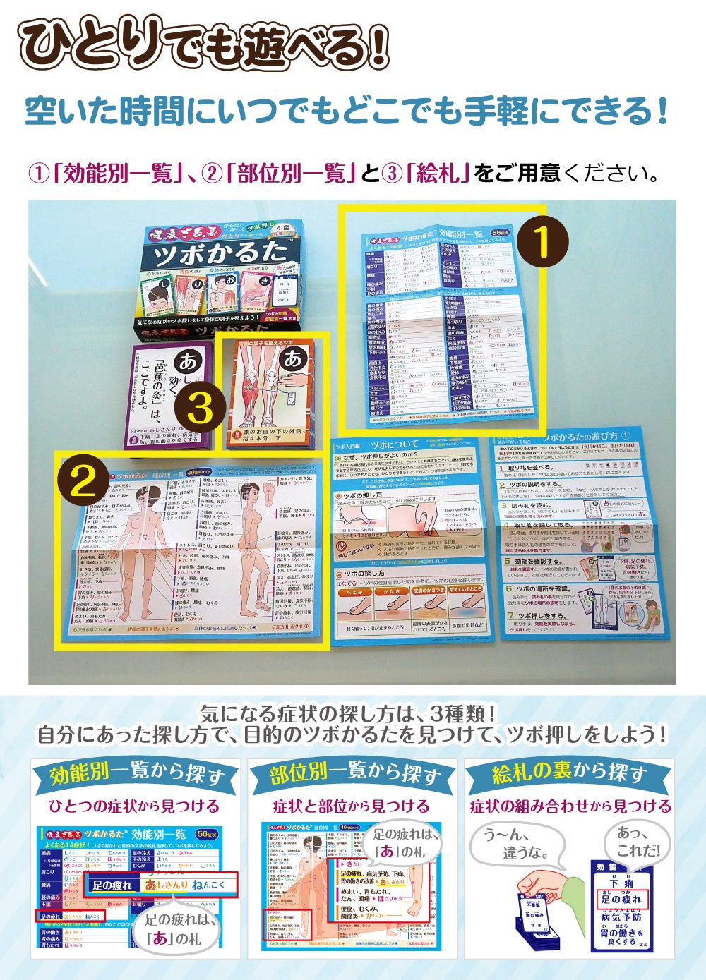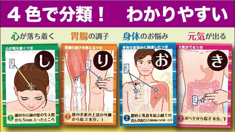 ツボの押し方・探し方をわかりやすくまとめているので、ツボかるた以外の用途でも使用可能です。