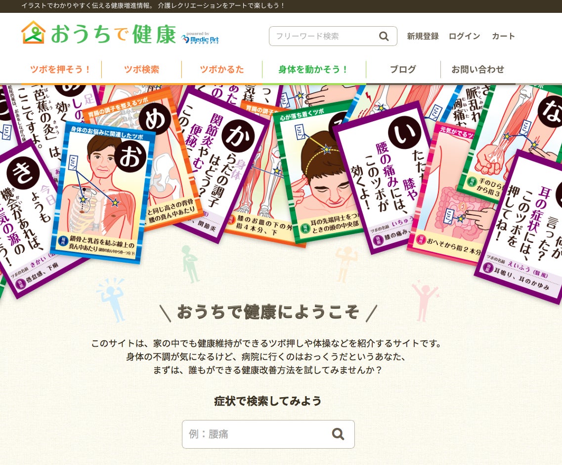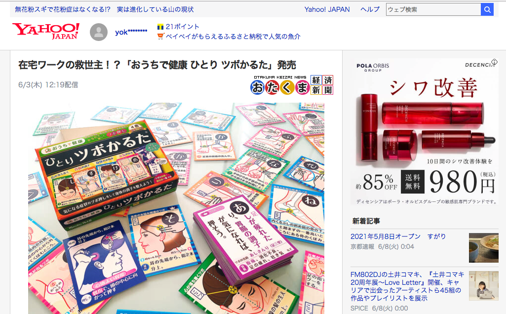 2021/06/05 19:47(1)『おうちで健康 ひとり ツボかるた』の販売ページが完成小さなサイズのツボかるたこと、『おうちで健康 ひとり ツボかるた』の販売ページが完成しました。こちらになります。https://ouchidekenkou.com/tsubo-karuta-2/今回の商品、「『ひとり ツボかるた』は、どんなもの?」かと言いますと、、、ひとりで遊ぶための、見る・読める情報が満載。見ていて飽きない、工夫を凝らした札のデザインになっています。読み札は、ツボの押し方がわかる札、絵札はツボの場所がわかる札になっています。絵札に様々な工夫が盛り込まれています。1. 「心が落ち着くツボ」「胃腸の調子を整えるツボ」「身体のお悩みに関連したツボ」「元気がでるツボ」の4種を色分け。元気がないときはピンクの絵札のツボを押すなど、絵札の色からツボを選ぶことができる。2. 「万能ツボ」「特効ツボ」「女性にオススメのツボ」「高齢者にオススメのツボ」をマークで分類。体全体の調子を整えたいときは、「万能ツボを選ぶ」などの使い方が可能。3.ツボの場所を探しやすい。ツボを探す際にポイントとなる場所や探すときのコツを記載。ツボは指の幅で長さを計るのですが、指幅の目安と定規がついています。さらに、ツボの厳格な場所を探すのではなく、このあたりにツボがありますという範囲を示しています。こちらのプレスリリースで、かなり詳しく記載しています!https://prtimes.jp/main/html/rd/p/000000018.000023879.html =================(2)YAHOO! で「ひとり ツボかるた」が紹介されました!https://article.yahoo.co.jp/detail/a72e4dd3d393377a535caecdd68f25f1d6da6ec6 =================(3)Tarzan Webで「ひとり ツボかるた」が紹介されました!雑誌『Tarzan』のウェブ版Tarzan Webにて、新商品の『おうちで健康 ひとり ツボかるた』が取り上げられました。https://tarzanweb.jp/post-236011 もっと見る