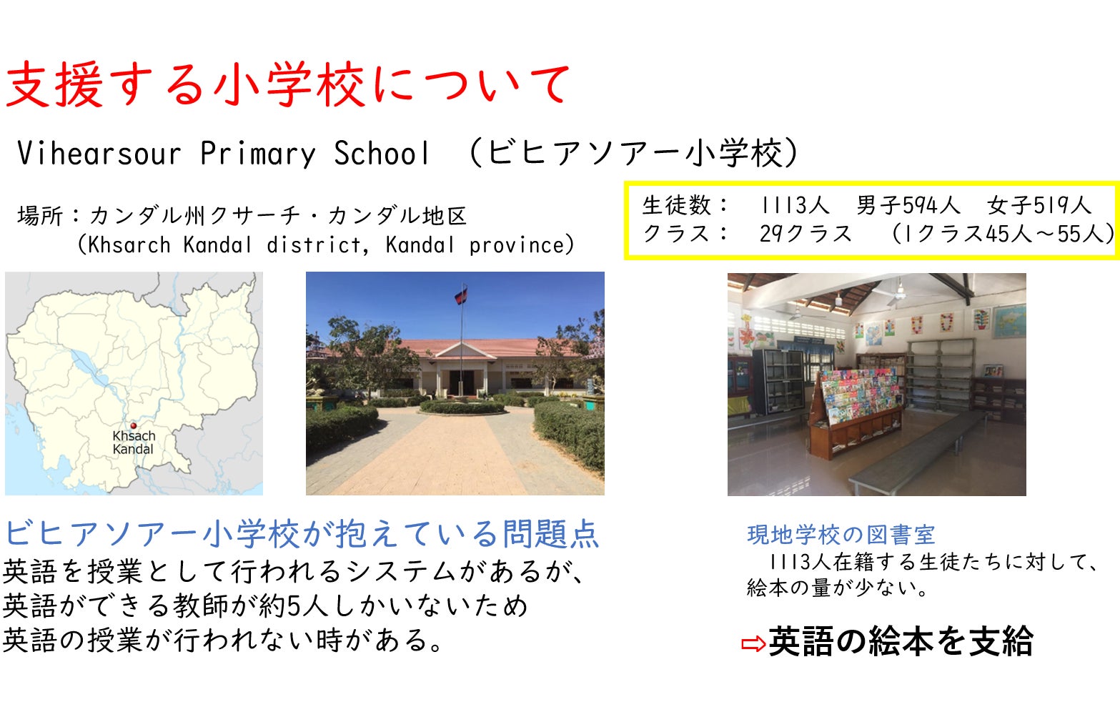 2、カンボジアの小学校に英語の絵本を届ける。
