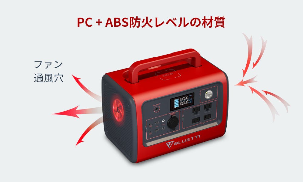 安全性優先のBLUETTI思想として、「BLUETTI EB70」の外装にはPC+ABS防火レベルの材質を用いているため、耐熱性と散熱性は抜群です。放熱効率を高めるため、内部温度が50℃になると内蔵ファンが自動的に起動し、50℃以下になると自動的に停止します。ファンには静音タイプを使用しており人が小さい声で会話するのと同じレベルの55dBです。