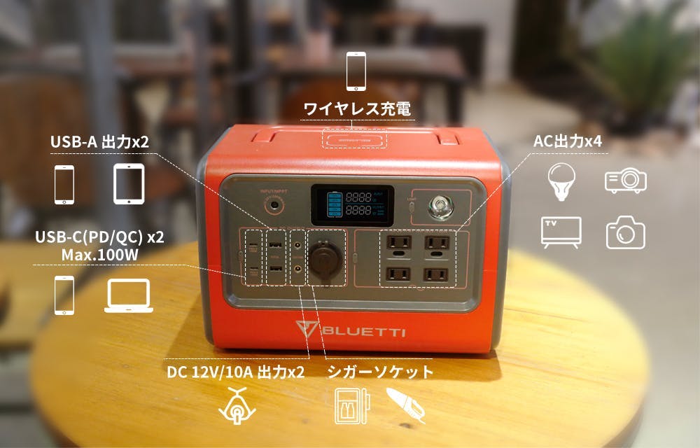 716Wh/700W「BLUETTI EB70」のACアダプターに対応することは言うまでもなく、DC、USB-A、USB-C、ワイヤレス充電にも対応します。USB-Cの場合、2つとも100WのPD3.0充電に対応しますので、iPhone 12などスマホの充電はもちろん、最新型のMacbookやiPad Proにも急速充電ができます。