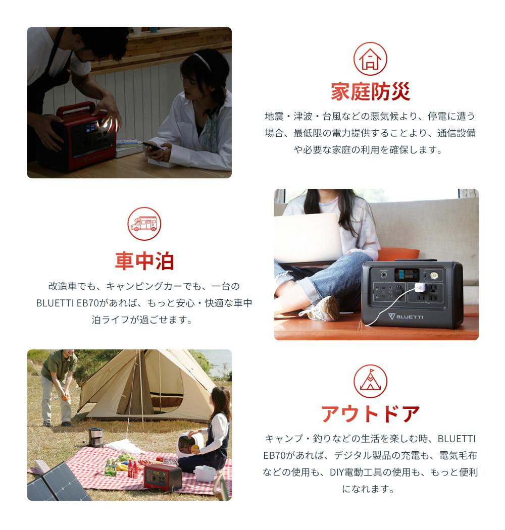 従来のBLUETTI製品について「大容量だけど重くて運ぶのに苦労する」との声を受けました。その点、EB70は女性でも気軽に持ち運べるほど軽くてコンパクト。軽量ボディーに必要な機能を全て備えており、電気容量も十分、機動性抜群の頼りになるポータブル電源です。これからのキャンプやBBQなどのアウトドアレジャーでは、必携アイテムの一つとなることでしょう。