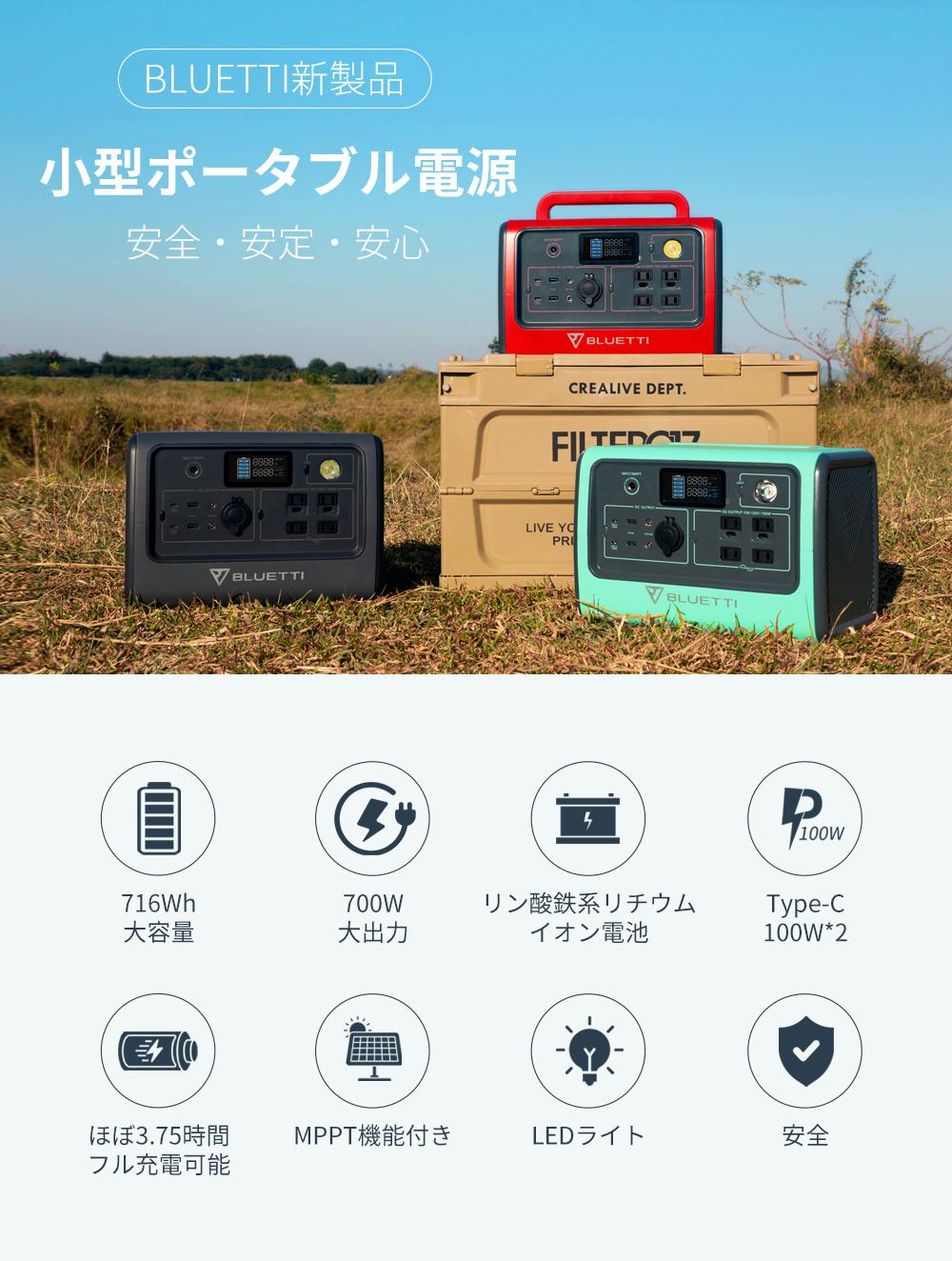 「BLUETTI EB70」に搭載するバッテリーは、リチウムイオン電池の中でも特に安全性の高い電気自動車用バッテリーに採用されるプレミアム版のリン酸鉄リチウムバッテリーを使用しています。