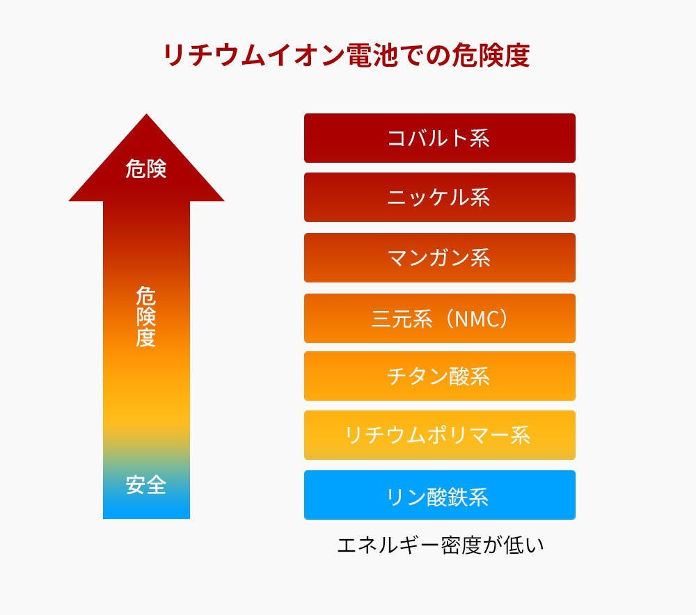 コバルト酸リチウムや三元系材料は220℃以上で熱分解を起こし危険性が高いとされていましたが、リン酸鉄リチウムはリン(P)と酸素(O)の結合が強く安定しているため600℃まで熱分解が起こらないなど、安全性が大幅に向上しています。