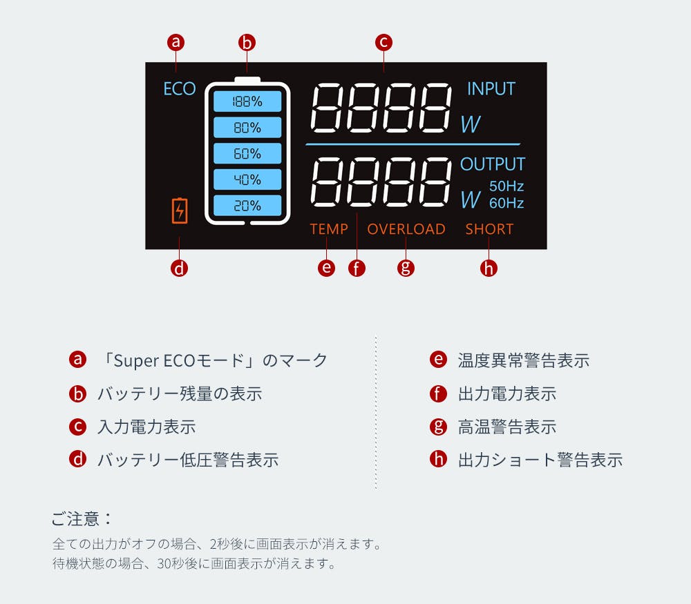 大きなカラーLCD液晶画面により、アイコンを見ただけで、出力電力やバッテリー残量、エラー表示など全情報が一目瞭然です。バッテリー切れ前に電量補足ができますので、急な電源切れに困ることも少なくなります。