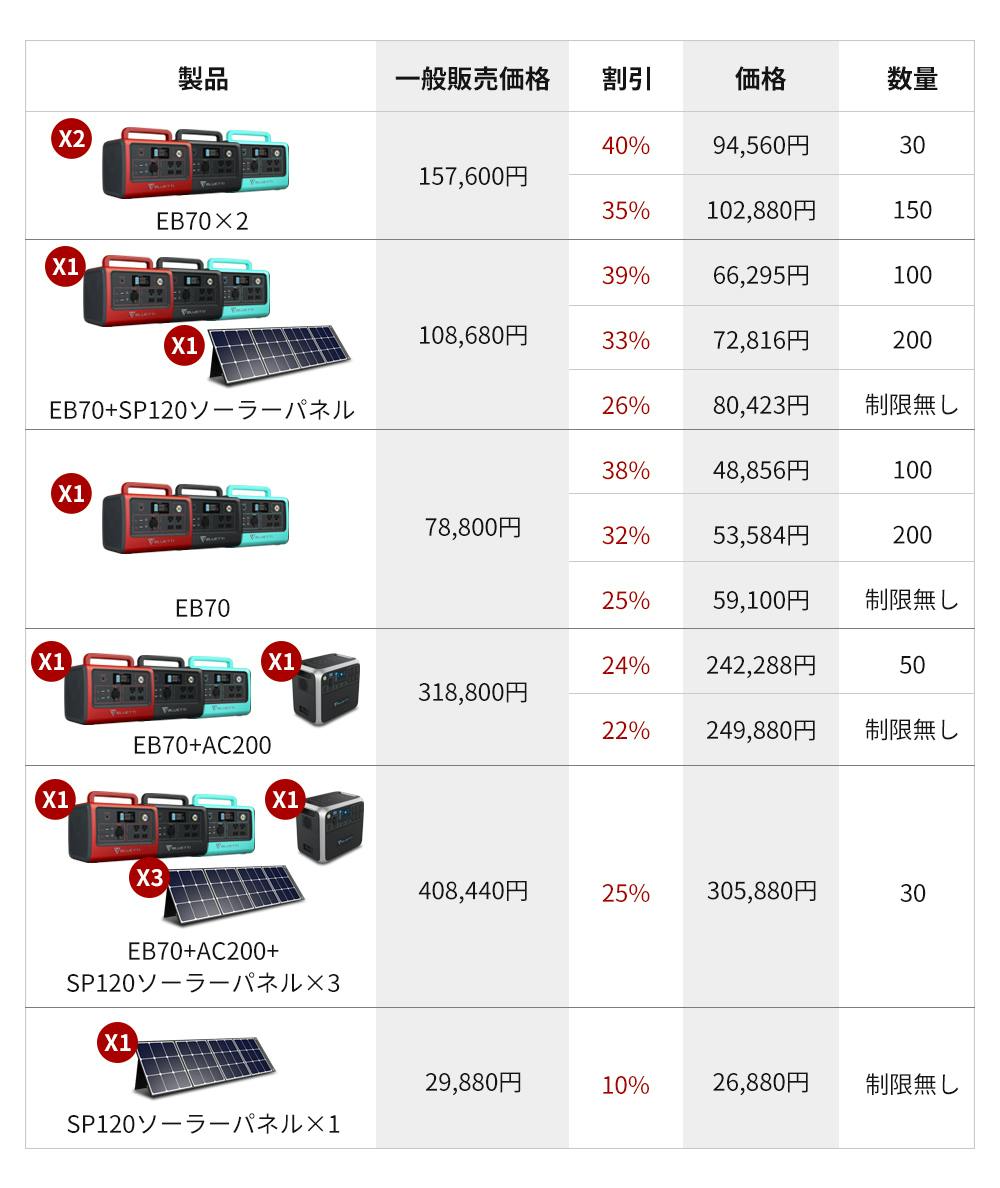 A5: BLUETTI EB70は1枚のみ使えます。(BLUETTI AC200を充電する場合には、最低でも2枚が必要です。太陽光が弱い時には2枚では低電圧となりますので、3枚の直列接続をお勧めします)