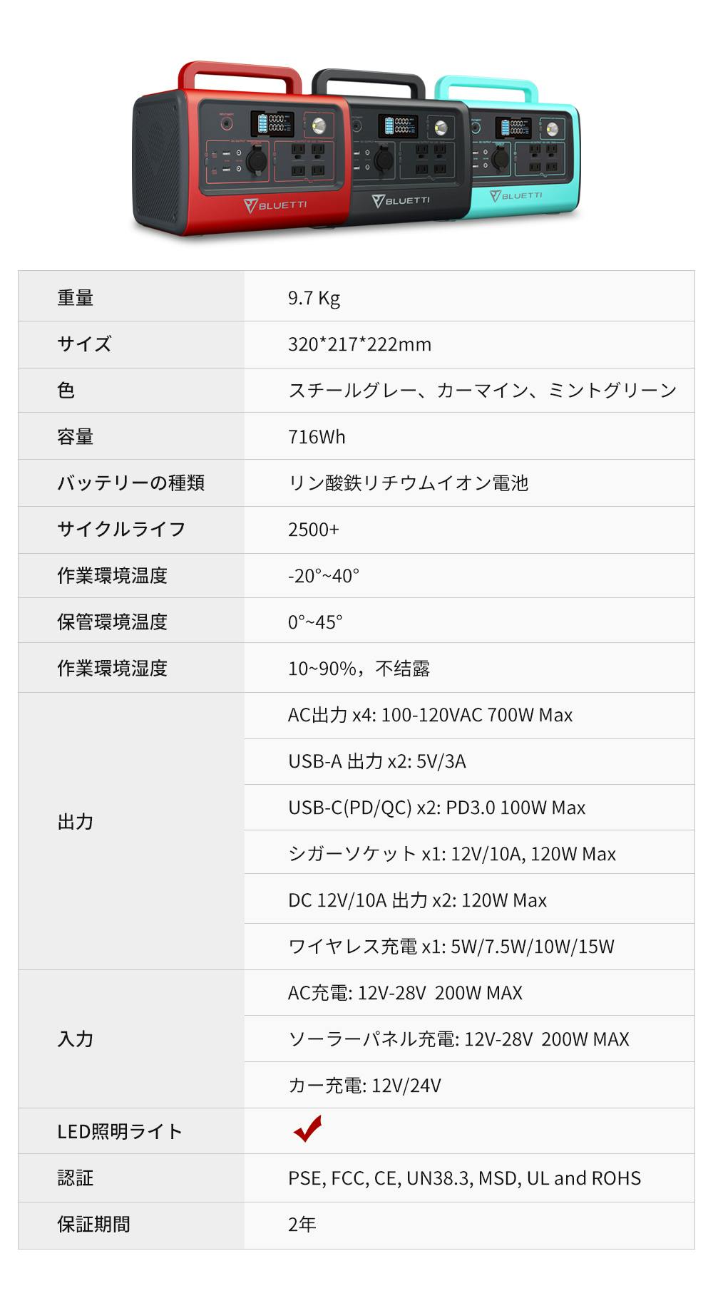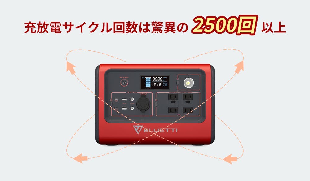 A2: BLUETTI EB70の充放電サイクル数は2500回以上です。従来の製品充放電サイクル数は300回~1000回と言われていますので、2~8倍の寿命ということになります。