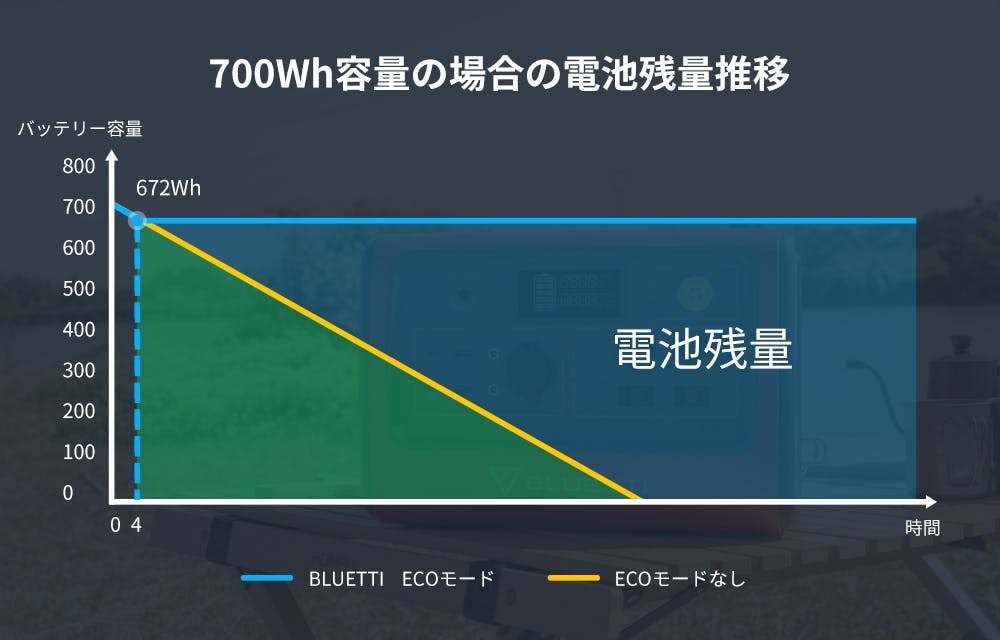 BLUETTIは地球に優しい製品を制作することを目標として、日々努力しています。EB70はBLUETTI特有のエコモードを搭載していますので、環境にやさしい省エネルギーポータブル電源です。一般のポータブル電源なら、AC出力をOFFにしないと、アダプターをささなくても電力を消耗し続けます。「BLUETTI EB70」は、エコモードをONにしておくと、ACの出力が20W以下で4時間継続すると、システムが自動的にAC出力をOFFにします。