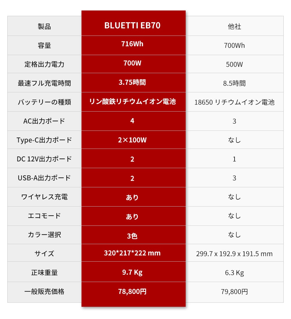 A2: BLUETTI EB70の充放電サイクル数は2500回以上です。従来の製品充放電サイクル数は300回~1000回と言われていますので、2~8倍の寿命ということになります。