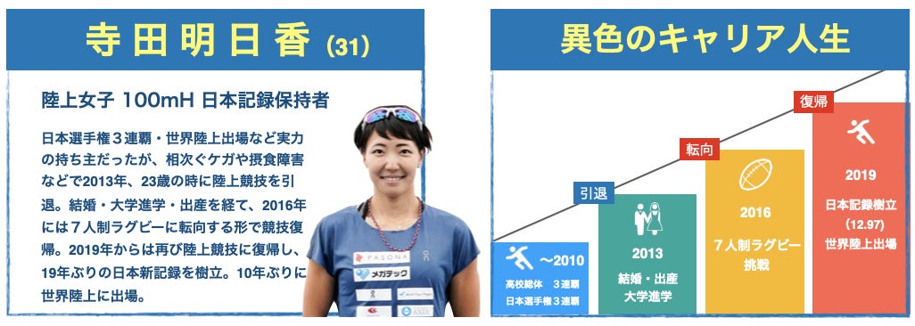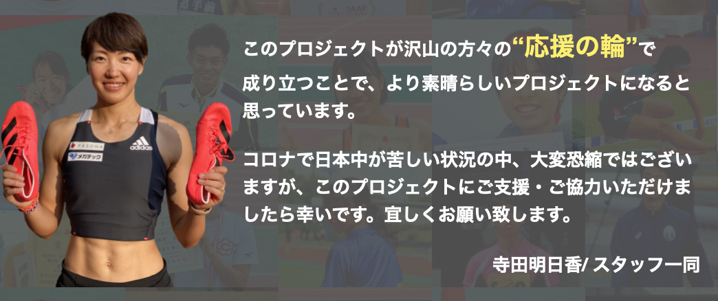初めまして。陸上女子100mハードルの寺田明日香です。私は現在、ママアスリートとして活動しています。今回、コロナという逆境の中で頑張っている次世代アスリートの為に初めてクラウドファンディングに挑戦します。どうぞ宜しくお願いします。