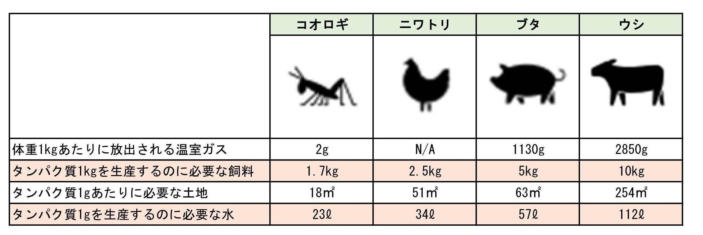 コオロギは1匹でタンパク質65%、脂肪20%、繊維5%で形成されている為、1匹で多くの動物性タンパク質を摂取することが出来ます。動物性タンパク質は植物性タンパク質より消化性が高く、アミノ酸プロファイルを持っています。ビタミンB12は、コオロギ100gあたり5.4μgで、推奨されている1日の必要量が1日2.4μgです。コオロギ100gで1日分の必要量を十分に賄うことが出来ます。地球環境に良く、飼育もし易く、他の食肉に比べ飼料も少ないと、良いこと尽くしのコオロギが注目されています。