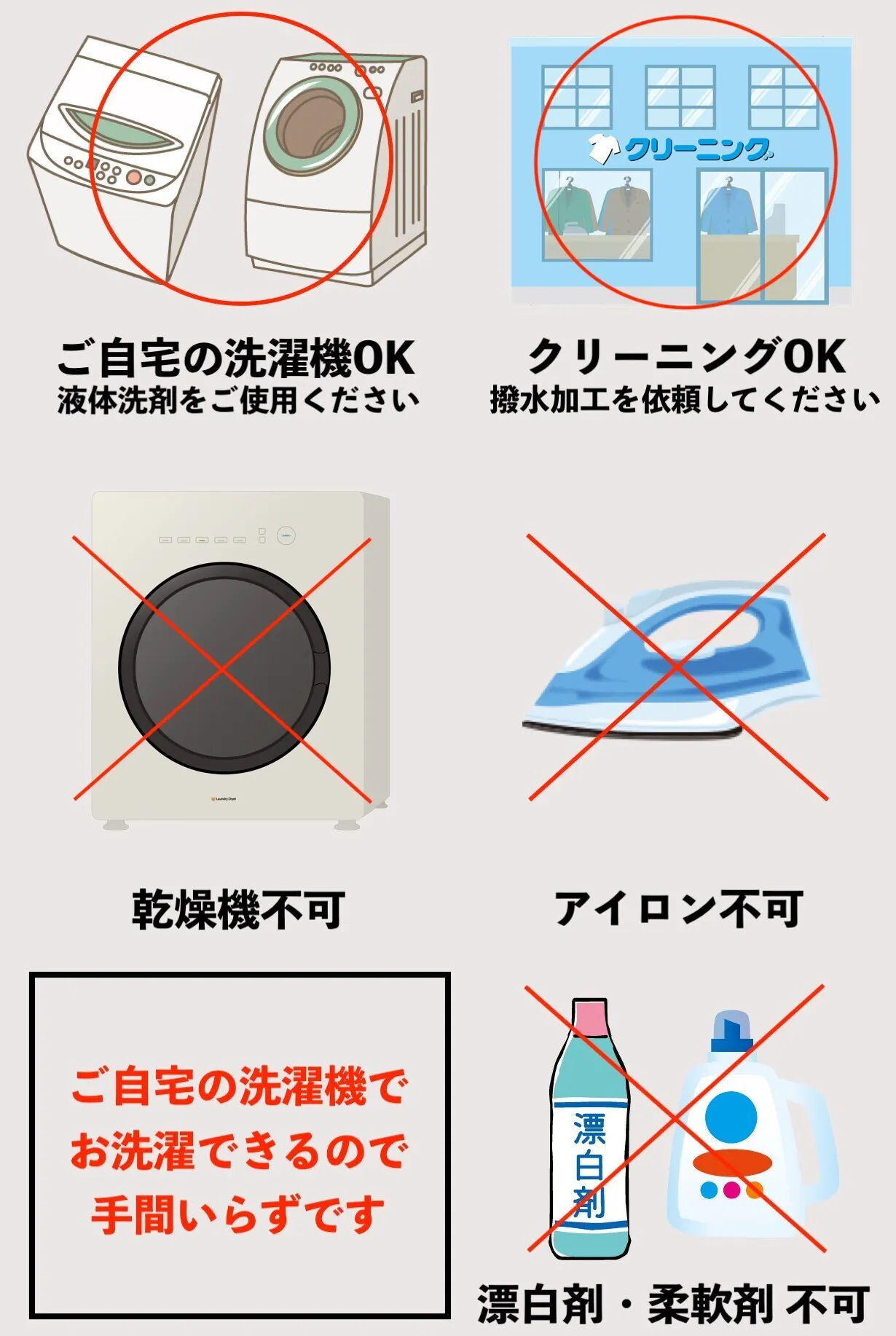 • 撥水 / 防汚 / 防水 / 40℃以下の水でご自宅の洗濯機でお洗濯可能