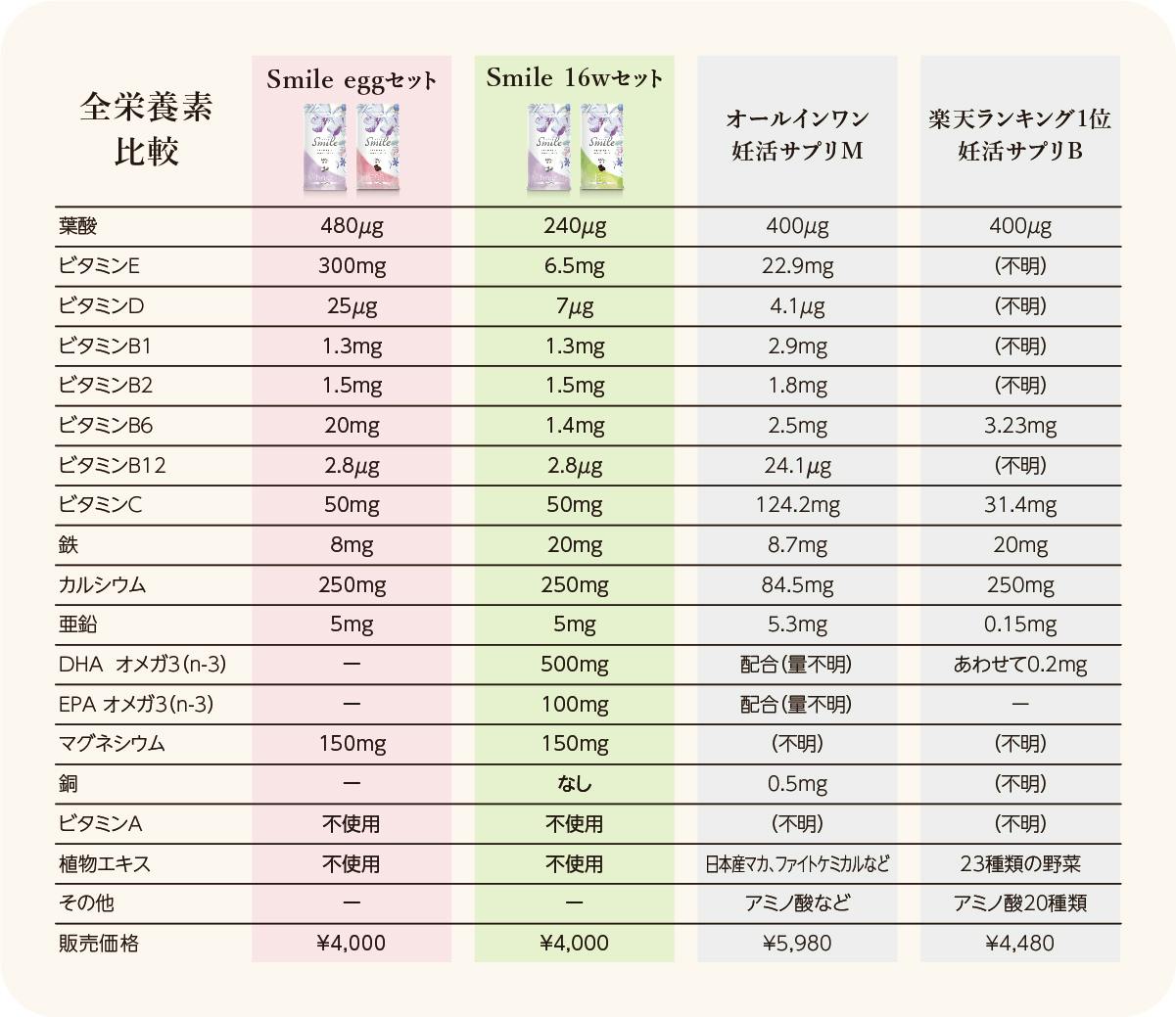 Smile(スミレ)は、他社人気製品と比べても、栄養素の配合量が断然違います。