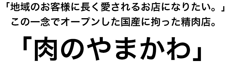 「高槻のお客様に長く愛される、地域密着のお肉屋さんになりたい。」この一念でオープンした全て国内産黒毛和牛、国産銘柄豚、国産若鶏にこだわった精肉店、それが、「肉のやまかわ」です。毎日使える&使いやすい低価格な「万能」切り落としから、ちょっとしたお肉のご馳走「焼肉、すき焼き、しゃぶしゃぶ」、そして、「はれの日」「ご褒美」、「贈り物」としても使って頂ける様な高級部位の姿切り、肉厚な黒毛和牛ステーキまで…、匠のセンスと目利きで、「品数・品質・うまさ」において、とにかくNO.1!そう、目指すは、「高槻ナンバーワン精肉店」というスローガンを 胸に、高槻の皆様の毎日の「美味しくて、“嬉しくなる”お肉料理」の献立に少しでも役立てられるお肉屋さんであれるよう日々努力、努力&工夫。「ほんまもんを誰にでも」のやまかわの匠だからこそ、「このほんまもんはどの家庭でも!」これが、肉のやまかわの信念です。なかなか珍しい内臓系もとびきり新鮮に、バラエティー豊富にラインナップ。国産若鶏や、国産銘柄豚を使った揚げ物は、誰でも気軽にお楽しみいただける「匠の味付け&惣菜シリーズ」。特に「コロッケ」はおかげさまで開店以来行列が途絶えることのない大人気っぷりで、今や、肉のやまかわ代表!堂々「激安!激ウマ!」高槻のお母さん応援団長なんです!低価格でも、ほんまもんの魂、ここにあり。これぞ「やまかわ」。いや、これも「やまかわ」。ほぼ365日、いつでも『笑顔・あいさつ・情熱』を合言葉に、高槻の皆様にとっての絶対「間違いない!お肉屋さん」になれるよう、元気一杯営業して参ります!