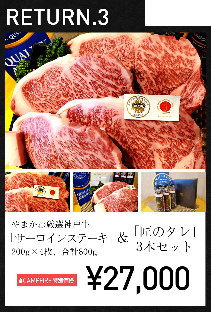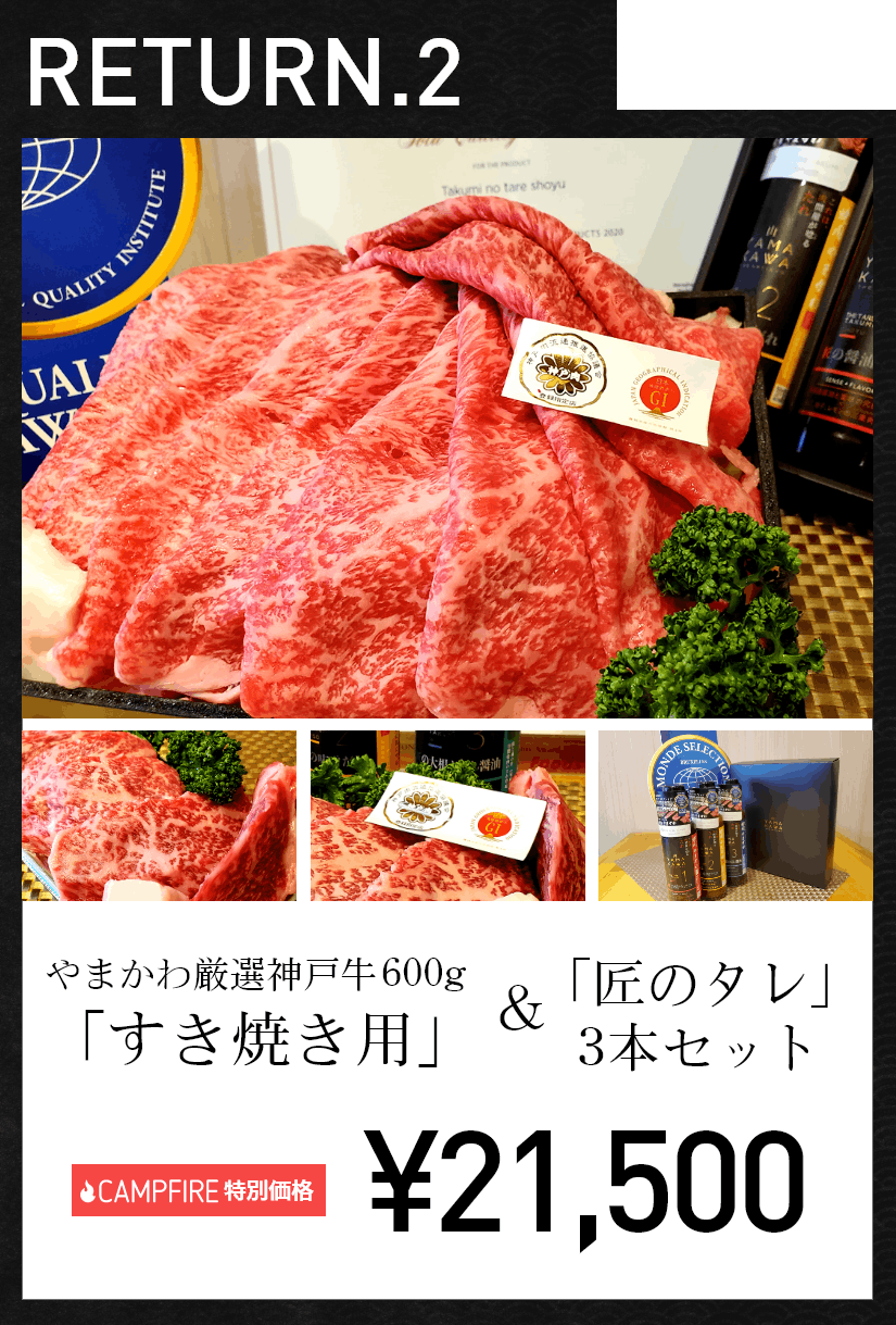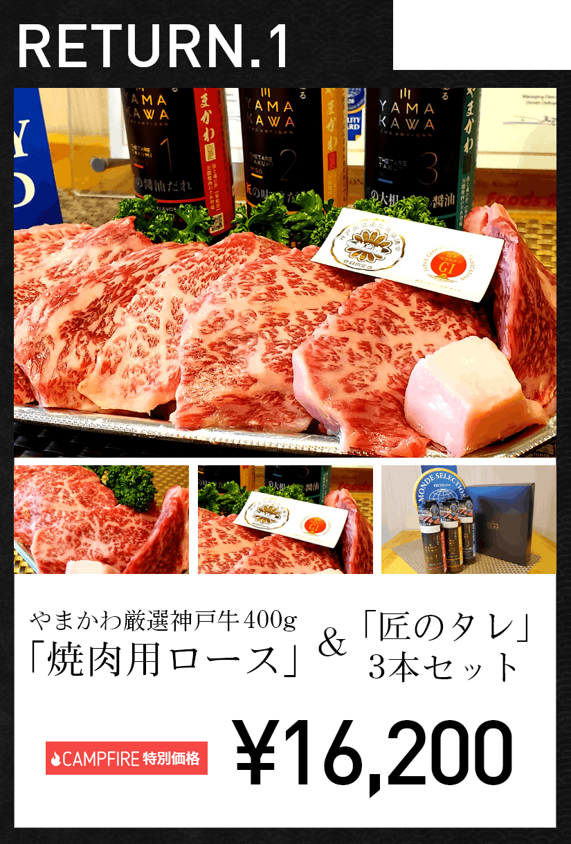 焼き肉用、すき焼き用、ステーキ用と厳選した神戸牛を確保しました!合わせて本プロジェクト限定、ここでしか手に入らない当社オリジナルのモンドセレクション金賞受賞「匠のたれ」を3本セットでお届けします!この3種類は、やまかわの匠たちが吟味に吟味を重ね絞り込んだ末、誕生した究極の3種類です。すなわち、この3本セットは、いわば、「贅沢な食べ比べ」を楽しむための“あえての”3本セット!やまかわ厳選最高の神戸牛とタレでお家焼肉にすき焼き、ステーキと… 存分にお楽しみいただきたいと思います!やまかわはいつでも、シンプルに「うまい肉」で応援したいのです!